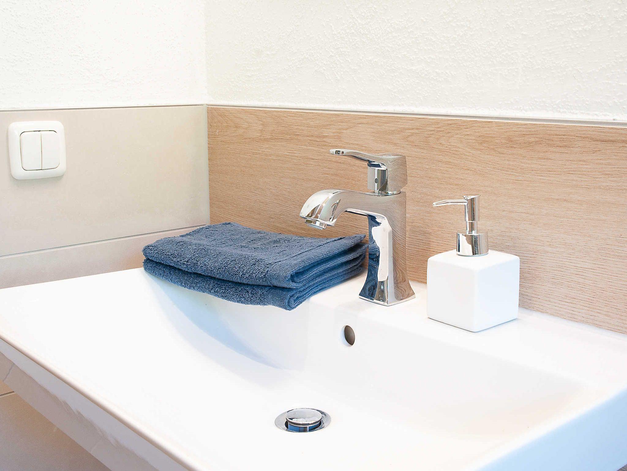 · Badezimmer mit Handwaschbecken, WC und ebenerdiger Regendusche, Fliesenboden mit Fußbodenheizung.