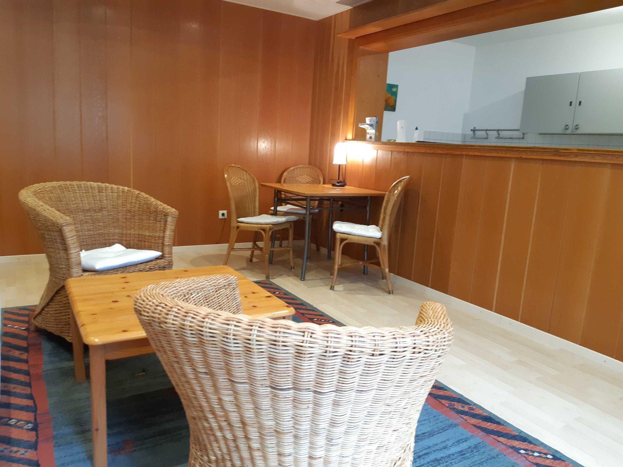 Das Wohnzimmer ist mit einer Couch, Sessel und Couchtisch ausgestattet. Ein Esstisch mit 4 Stühlen vervollständigen die Ausstattung.