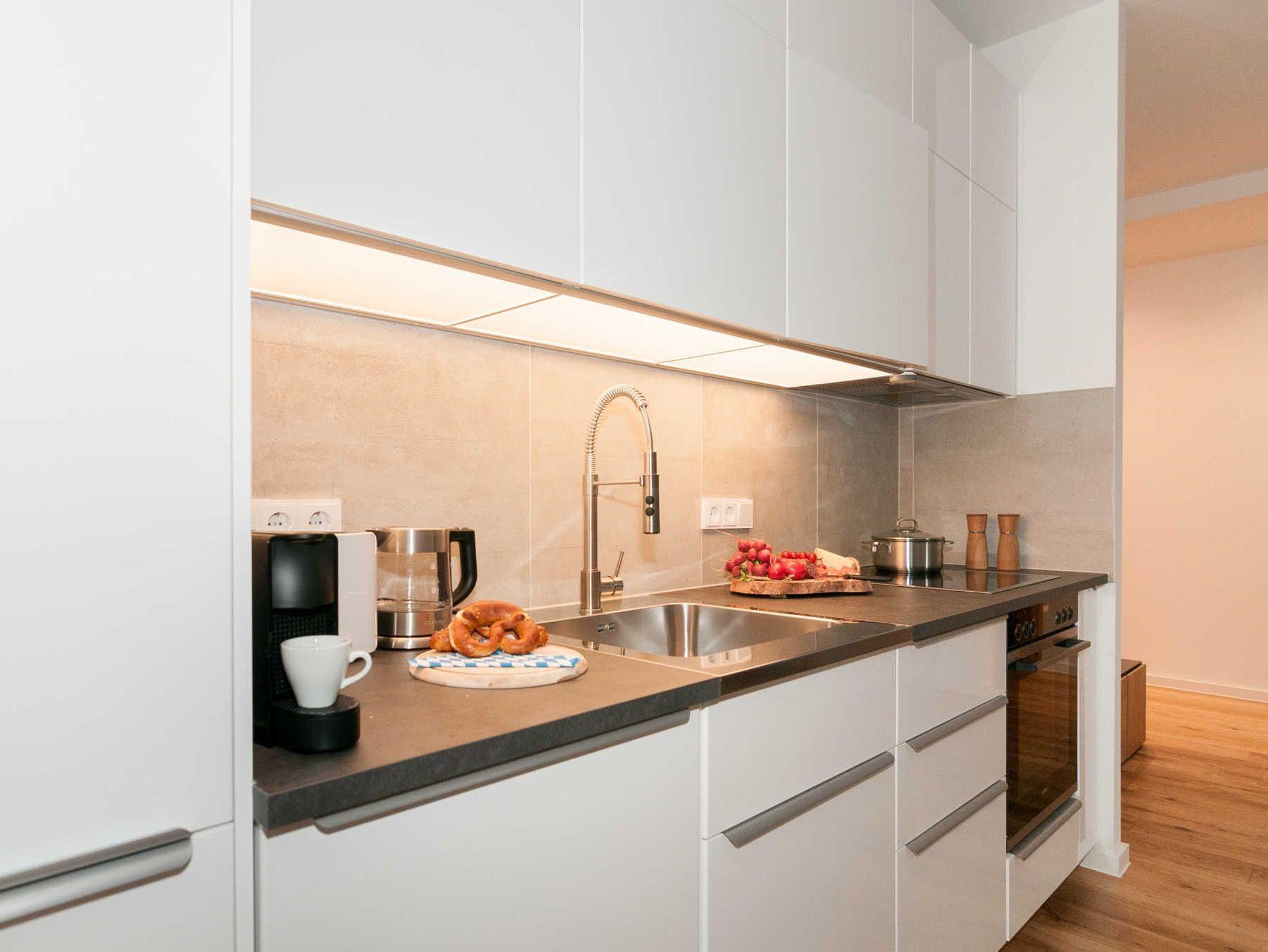 Ferienwohnung im Zentrum von Rottach-Egern mit Wohnzimmer, offener Küche, Schlafzimmer und Ausweichzimmer, Bad und Terrasse. Die Ausstattung ist modern und wertig.