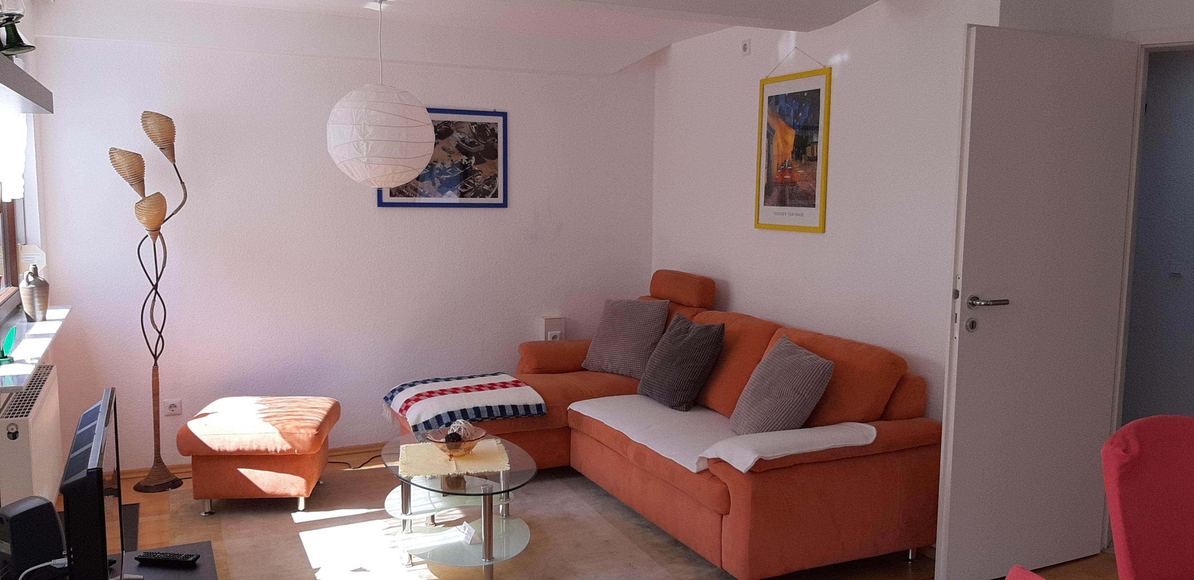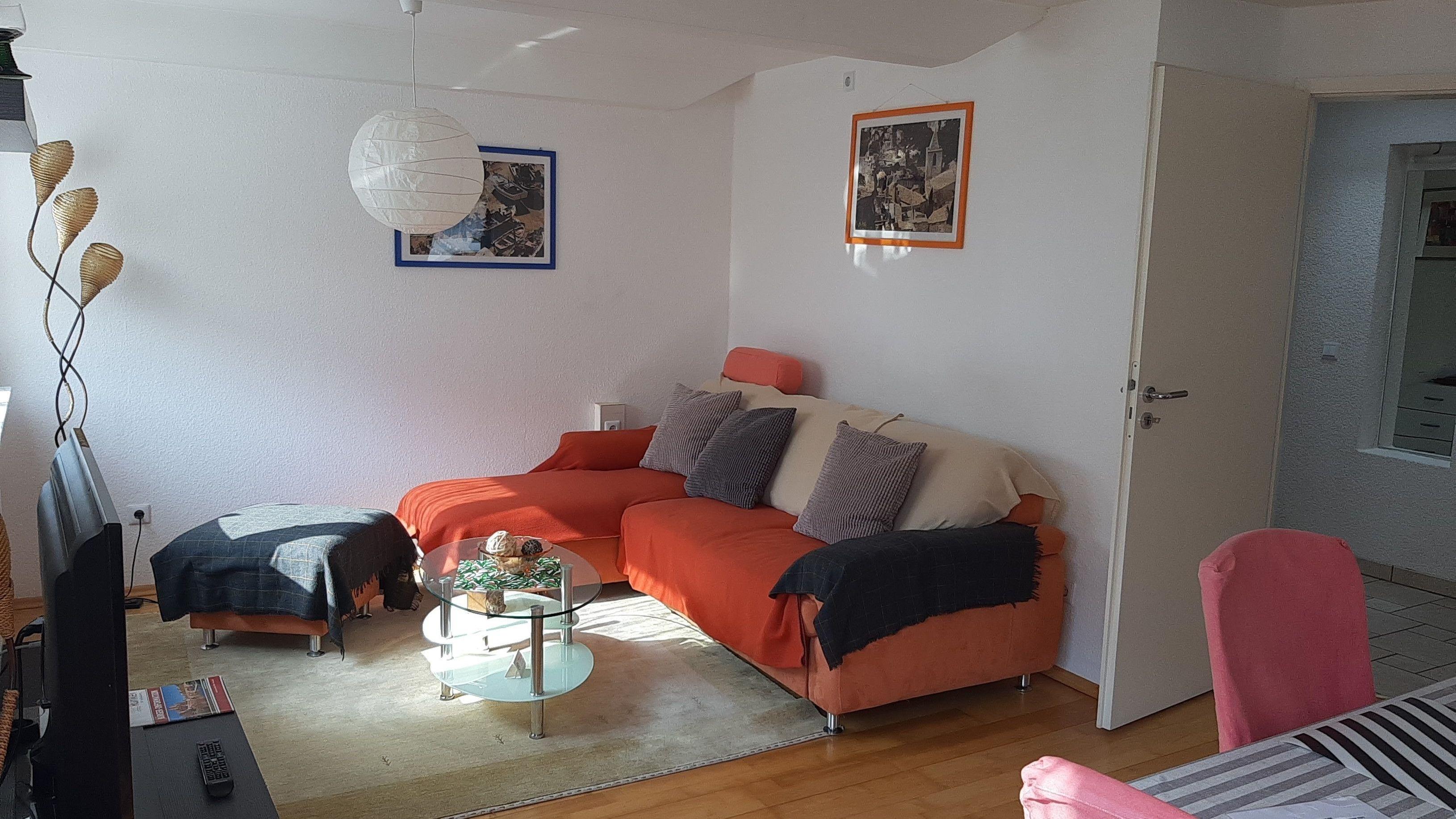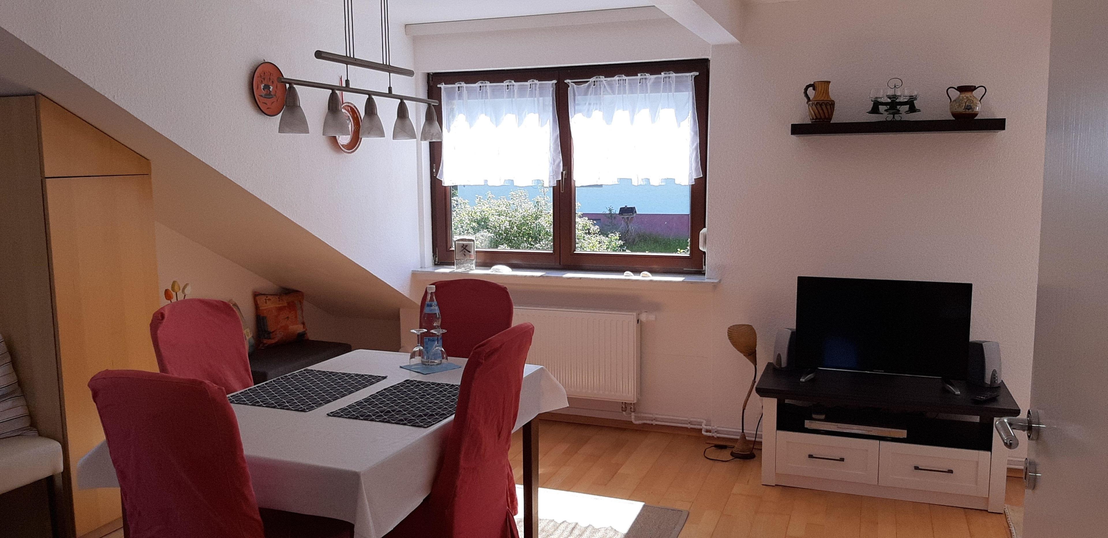 Das großzügige Wohn- und Esszimmer ist mit Essecke, TV, DVD- Player, Hifi- Anlage, Couch und großer Spiele- und Puzzlesammlung ausgestattet. Dort befindet sich die Couch, die als Schlafcouch ausgezogen werden kann.