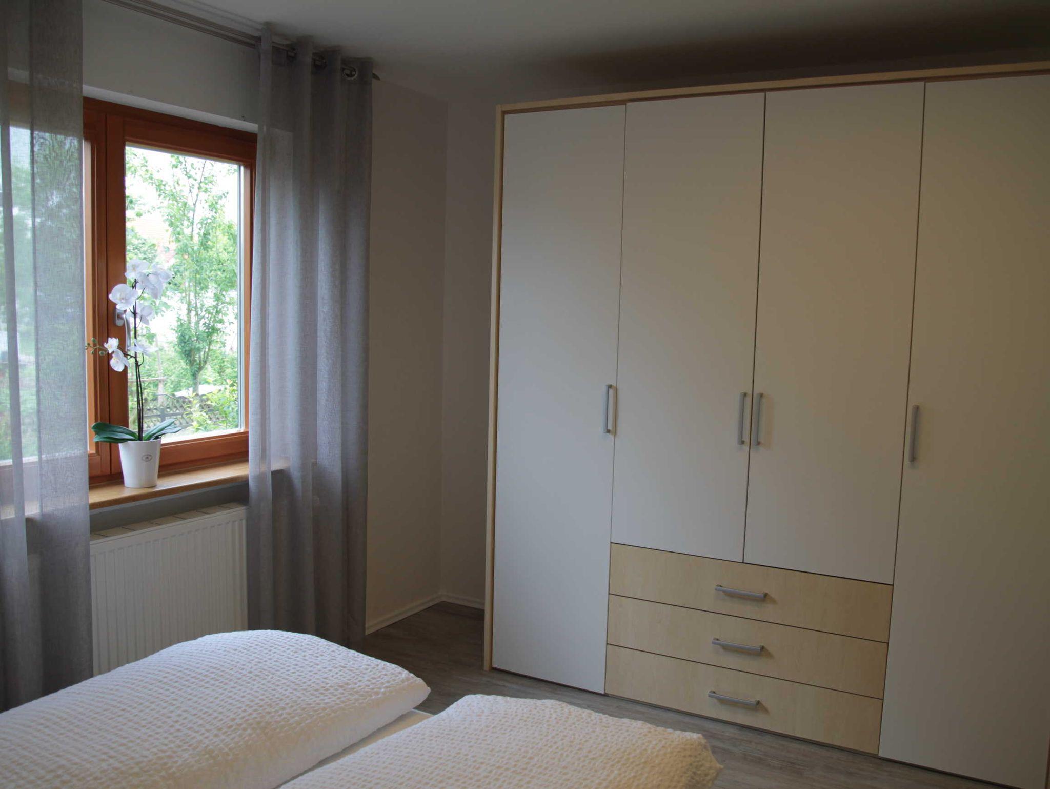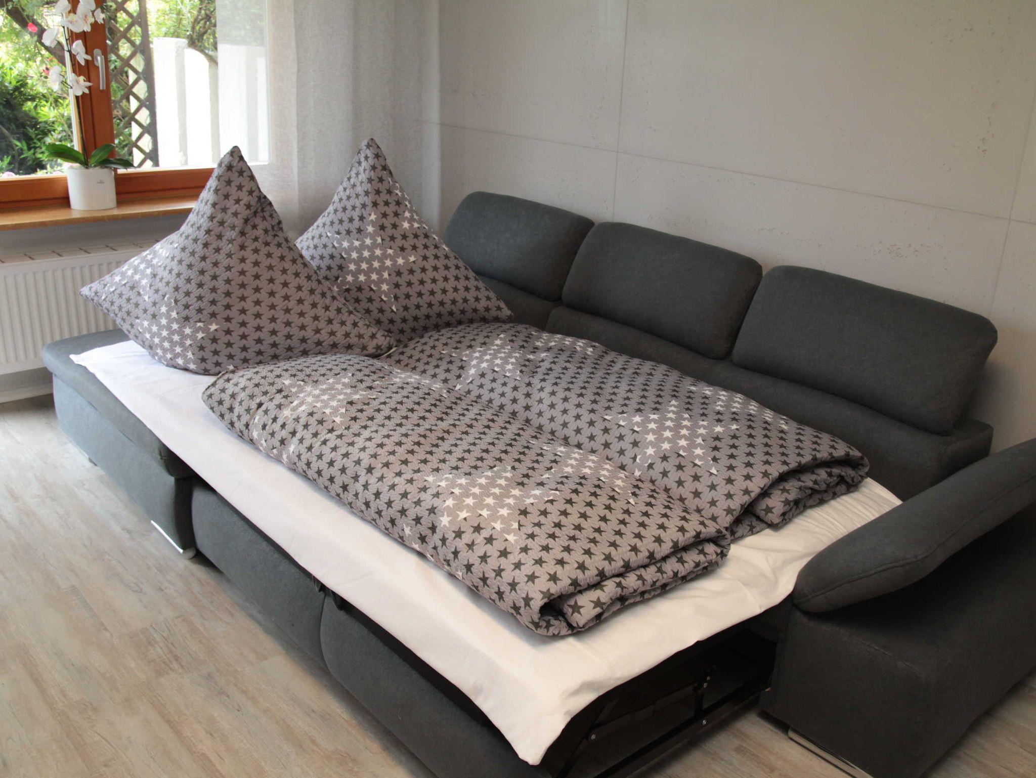 Wohn- und Schlafzimmer: Schlafzimmer mit Boxspringbett 160x200 cm und 1 Etagenbett 90x200 cm, Wohnzimmer mit Schlafsofa 140x200 cm.