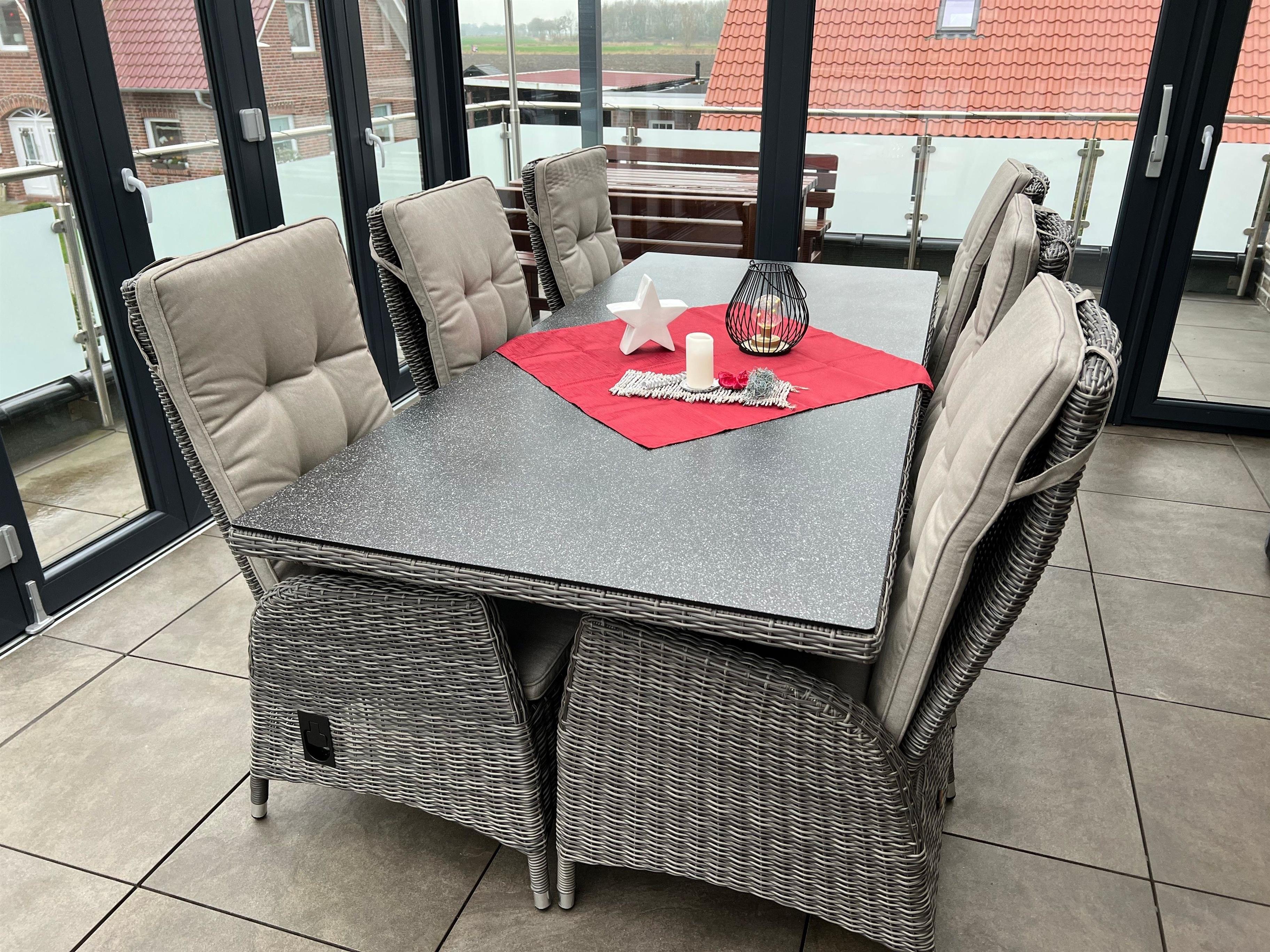 Die Ferienwohnung verfügt im Obergeschoss über einen ganzjährig nutzbaren Wintergarten mit Beschattungsmöglichkeit, einer Sitzgarnitur und zwei Sonnenliegen. Der Blick aus dem Wintergarten über den angrenzenden Kanal ist wunderschön.