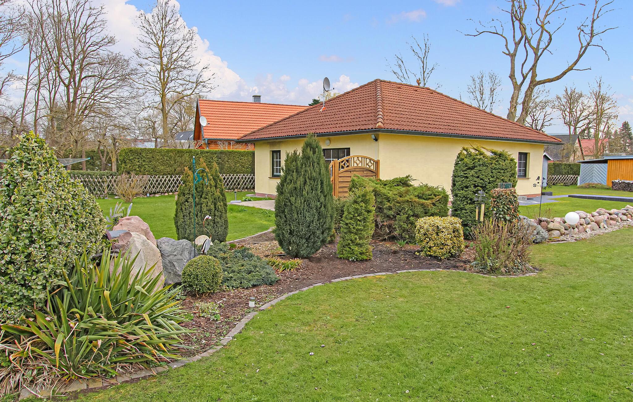 Das freistehende Ferienhaus im Bungalowstiel befindet sich separat auf dem 8500 qm großen und geschmackvoll angelegten Wohngrundstück des Eigentümers in Ortslage. Es wurde im Jahre 2021 komplett modernisiert und neu ausgestattet. Vorhanden sind ein Wohnraum (Polstermöbel, Esstisch, Flachbild-TV), eine separate Küche (E-Herd mit Backofen, Kühlschrank mit Tiefkühlteil, Spülmaschine, Esstisch, Internetradio, div. Küchengeräte), zwei Schlafräume (1 x Doppelbett, 1 x Einzelbett und Rollbett) sowie ein Bad mit DU und Badewanne. Das Haus verfügt über eine Zentralheizung. Für Kleinkinder können ein Kinderreisebett und ein Hochstuhl bereitgestellt werden. Internet (D-LAN) ist ebenfalls vorhanden. Im Außenbereich gibt es eine möblierte Terrasse, Grill, ein kleiner Kinderspielplatz, PKW-Stellplatz und ein Fahrrad-Schuppen.