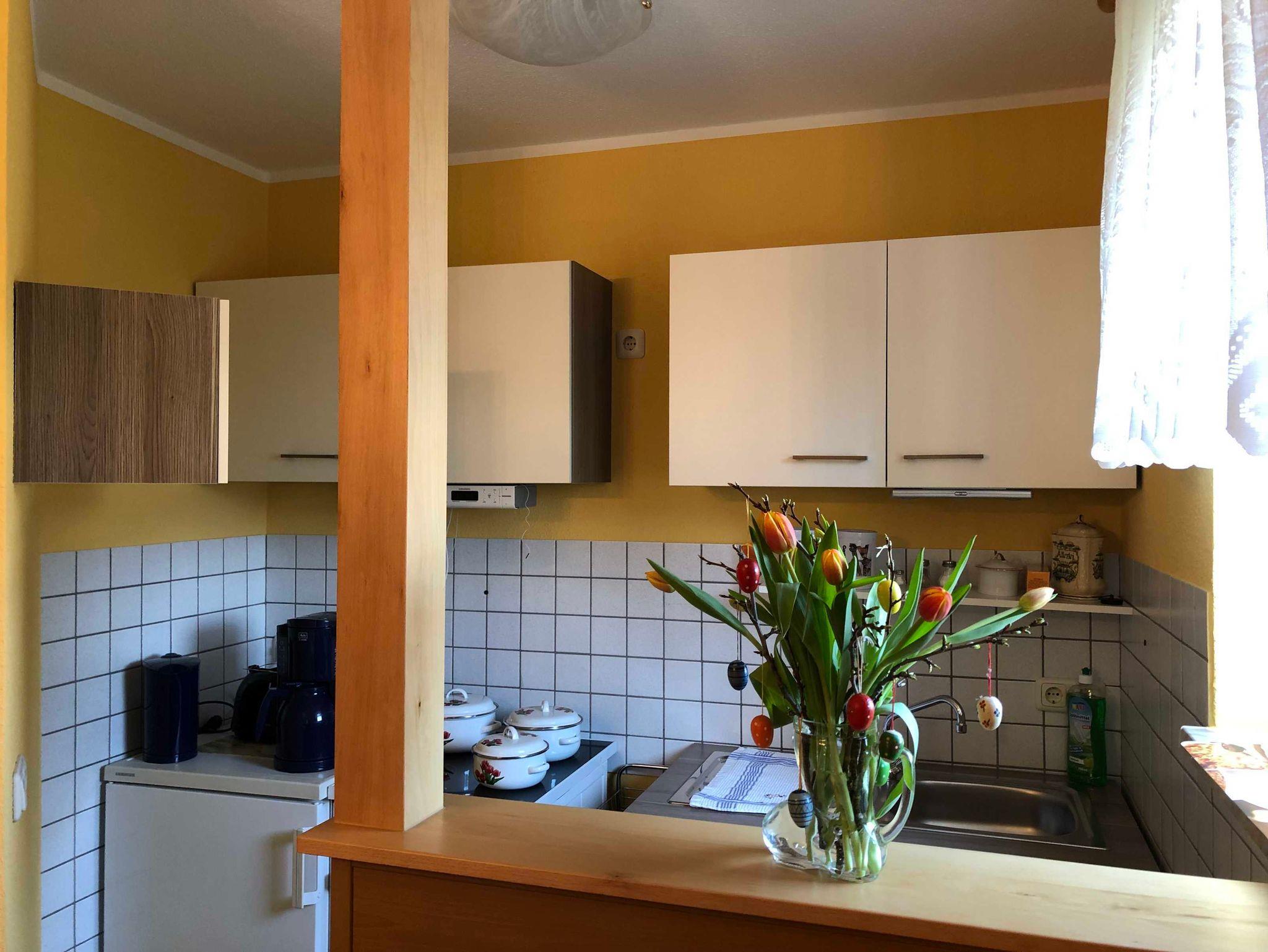In der Küchenzeile gibt es einen Herd mit Backröhre, Kühlschrank mit Gefrierfach und eine Spüle. Weiterhin sind Kaffeemaschine, Toaster, Wasserkocher, Geschirr, Gläser, Besteck, Wischtücher und andere Küchenutensilien vorhanden.