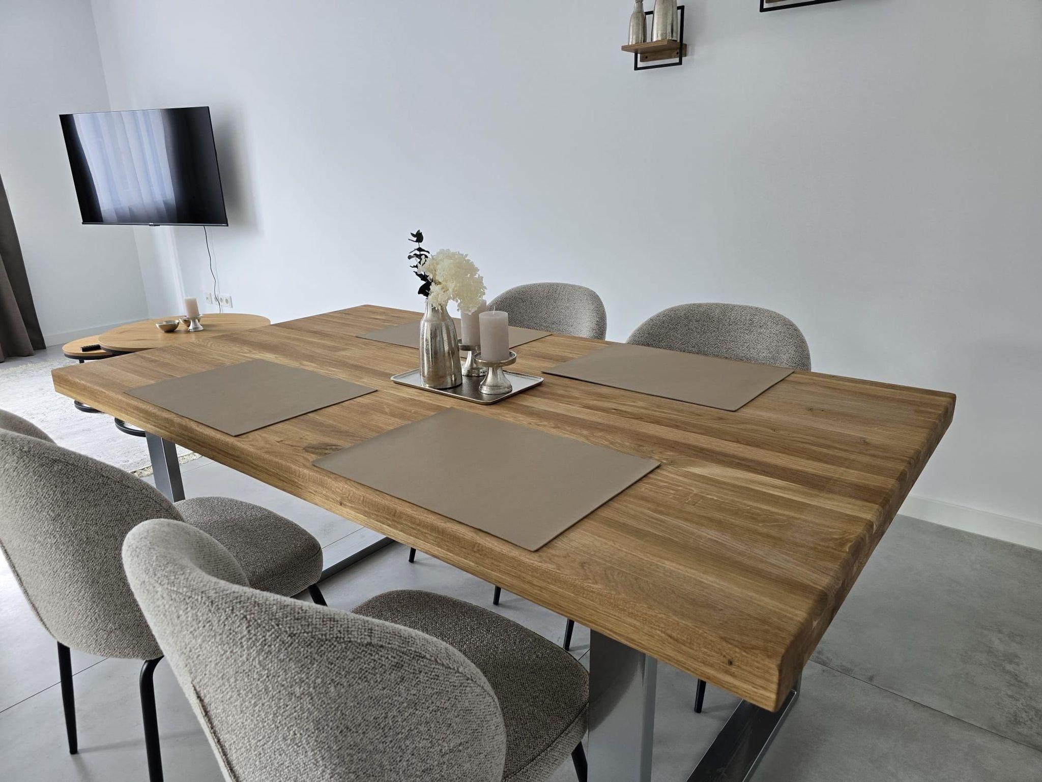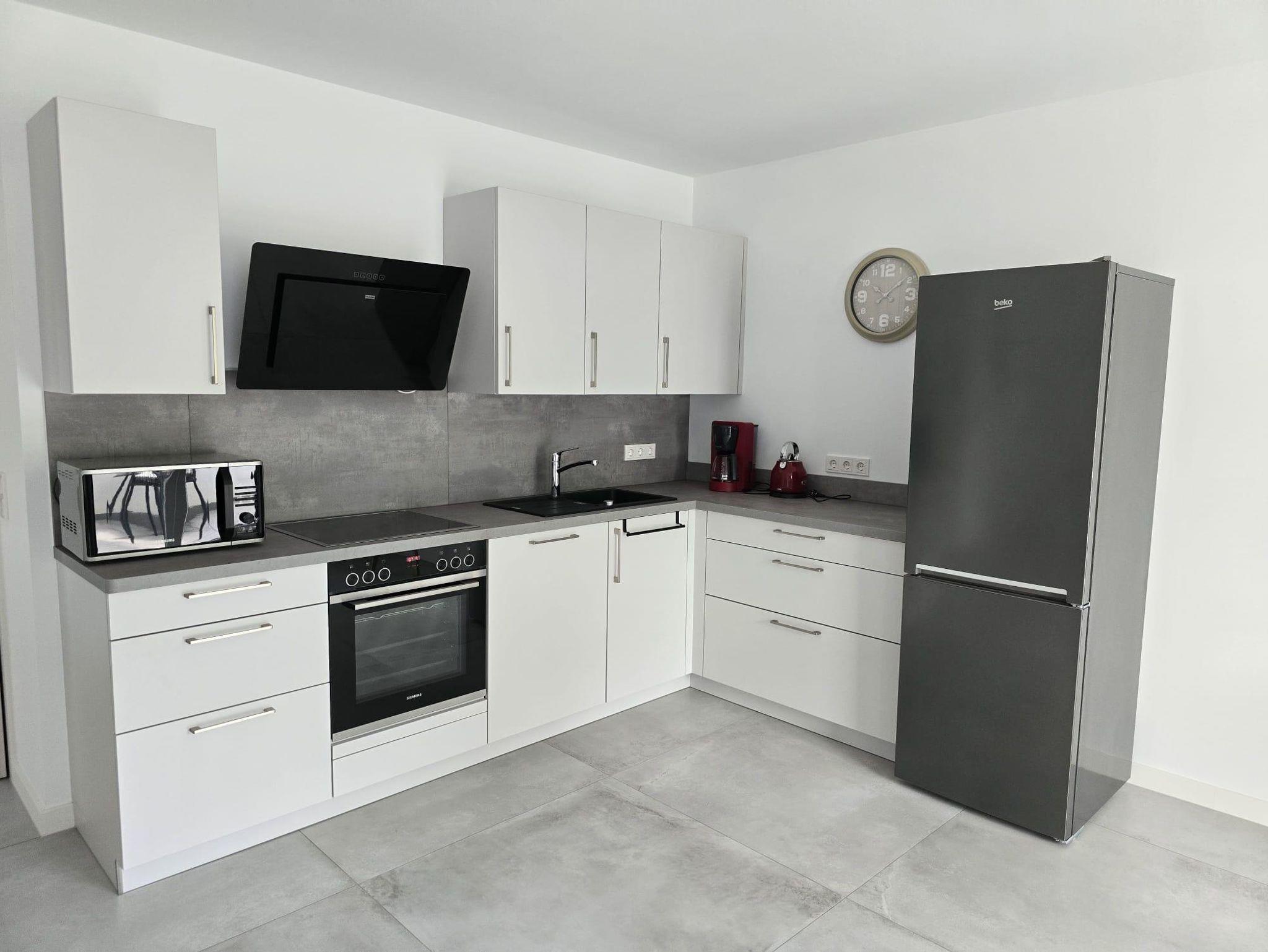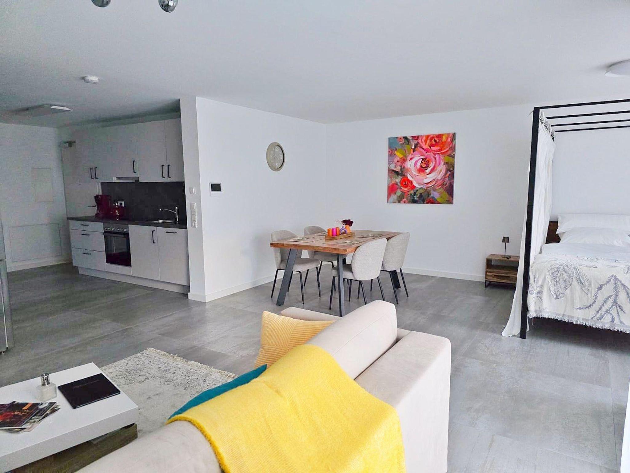 Mit einer Wohnfläche von ca. 65 qm laden wir Sie herzlich in unsere neu gebaute und moderne Ferienwohnung ein. Der offene Wohnraum umfasst einen großzügigen Wohn-, Schlaf- und Essbereich und eine offene, gut ausgestattete Küche. Vom Wohn-, Schlaf- und Essbereich haben Sie direkten Zugang zur überdachten Terrasse mit Sitzgarnitur, auf der Sie den Abend bei einem Glas Wein ausklingen lassen können. Darüber hinaus gibt es ein geräumiges Badezimmer mit ebenerdiger Dusche und WC.