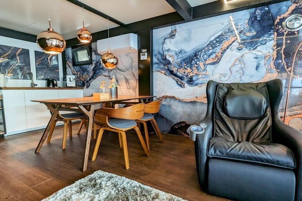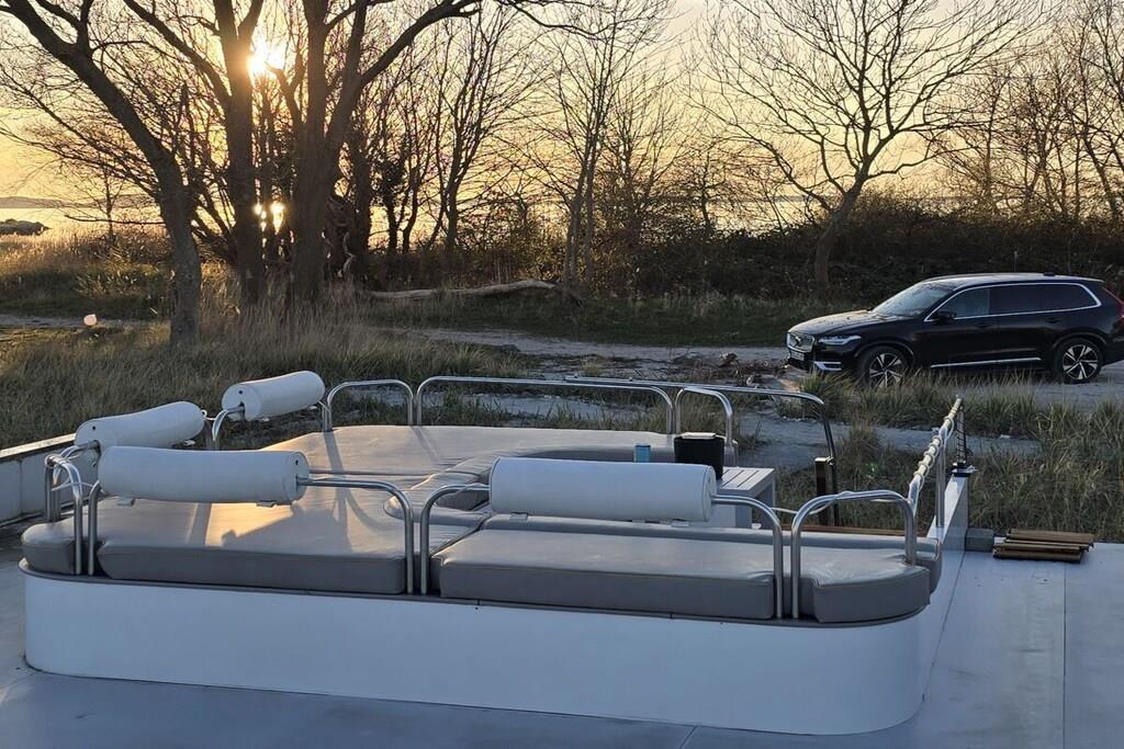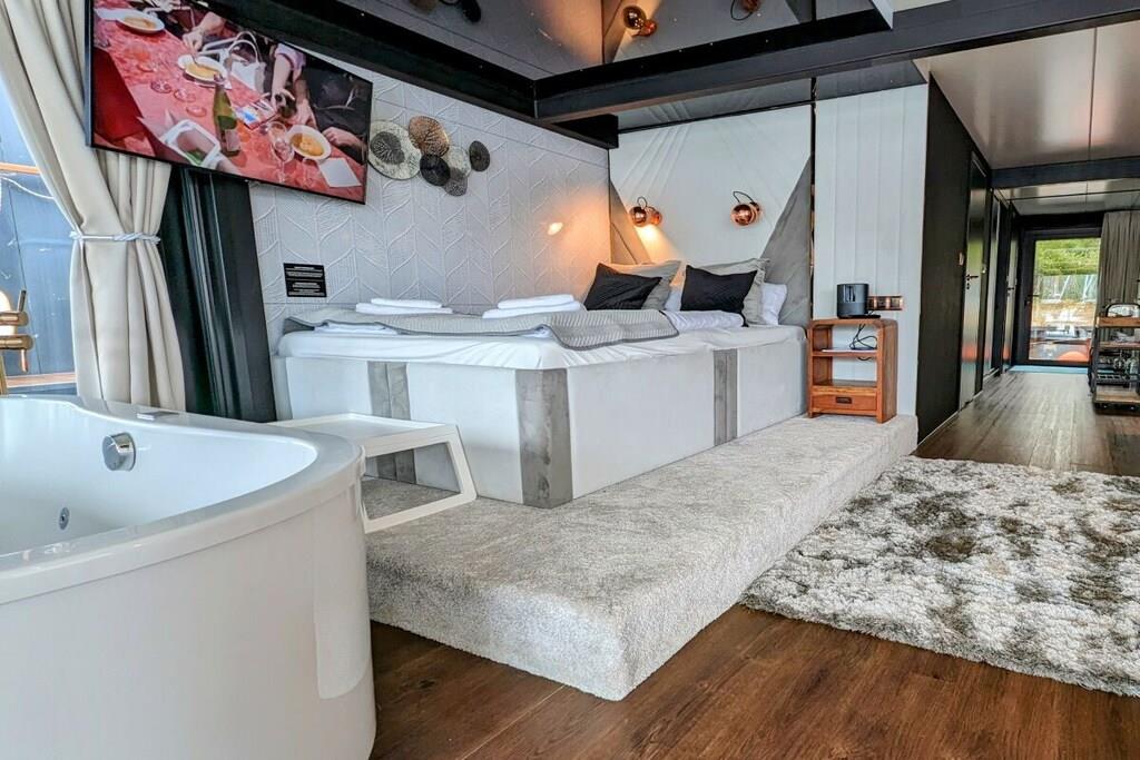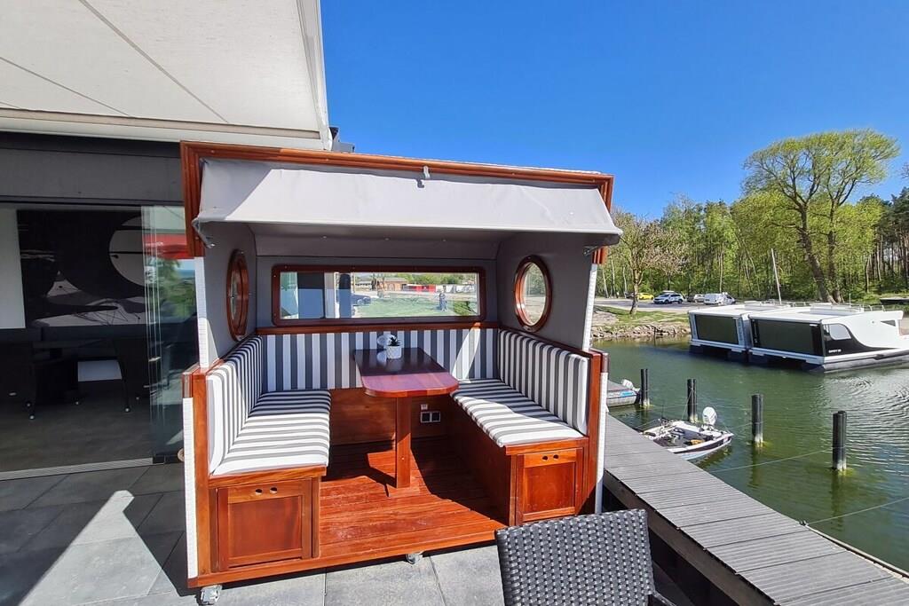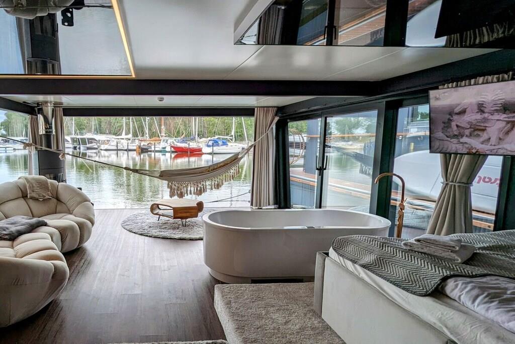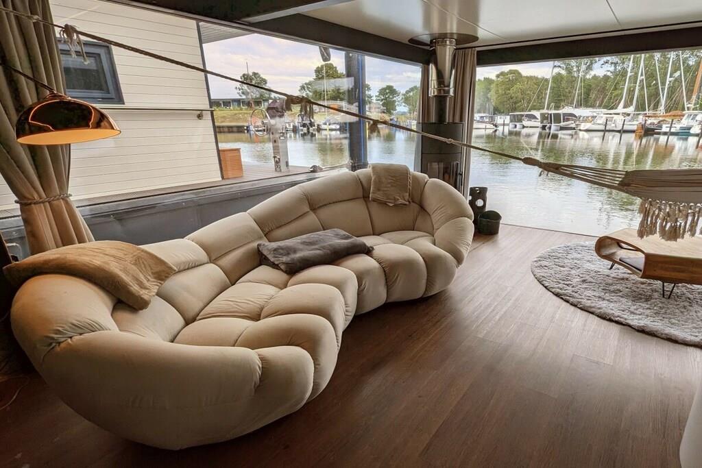 You can't get any closer to the water for a holiday. The idyllic and currently growing little harbor on the Jasmund Bodden – Martinshafen – is home to a unique, permanently moored houseboat with a suite-like atmosphere. From the bed, you can gaze through the large panoramic window across a whirlpool tub directly into the harbor, enjoying unparalleled views of nature and birdlife. A massage chair and a fireplace provide a special wellness experience. A small dry sauna and two bathrooms with large showers complete the luxurious amenities. A second, separate cabin offers an additional retreat. A refrigerator, sink, coffee maker, and toaster allow for self-catering. Breakfast can be ordered at the harbor bistro. Just around the corner, the beach invites you to enjoy water sports or simply relax and watch the waves.