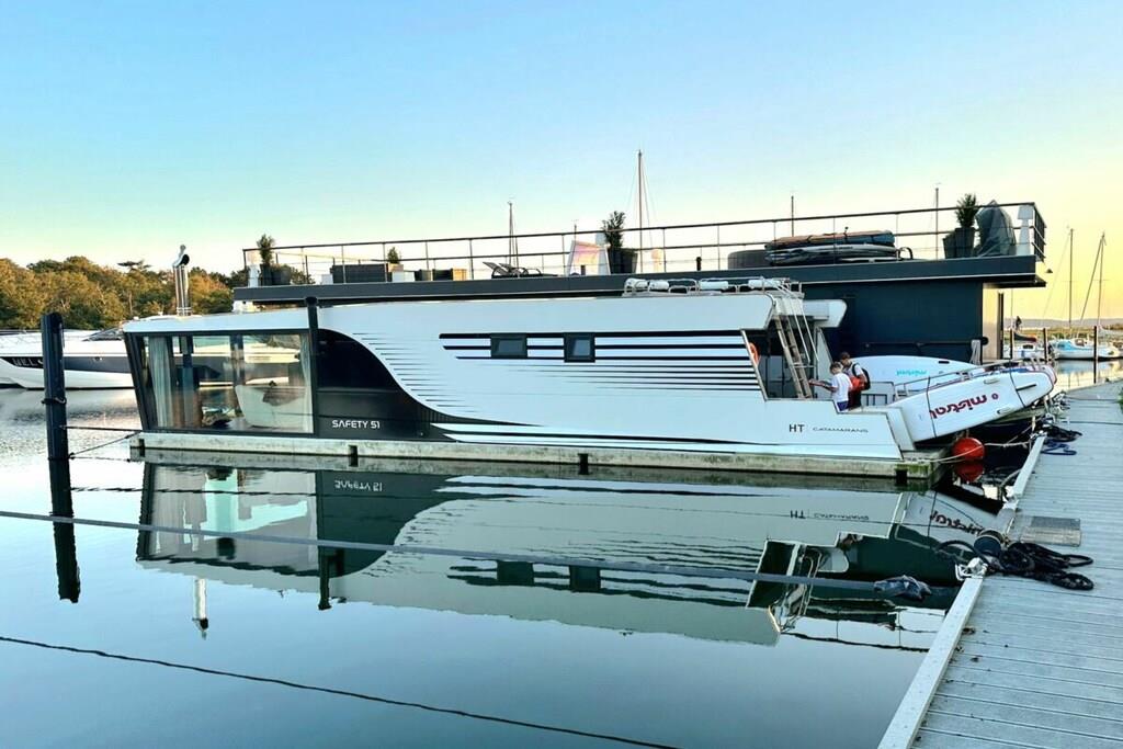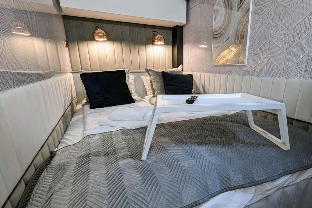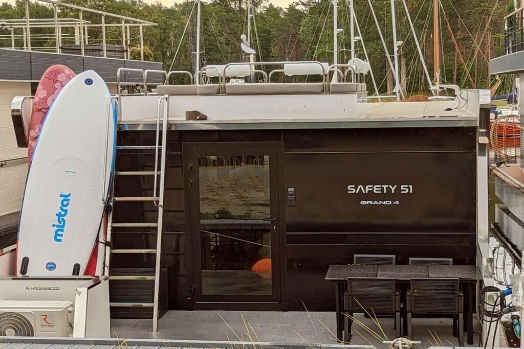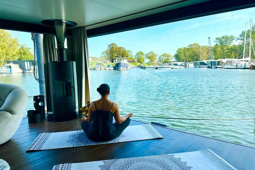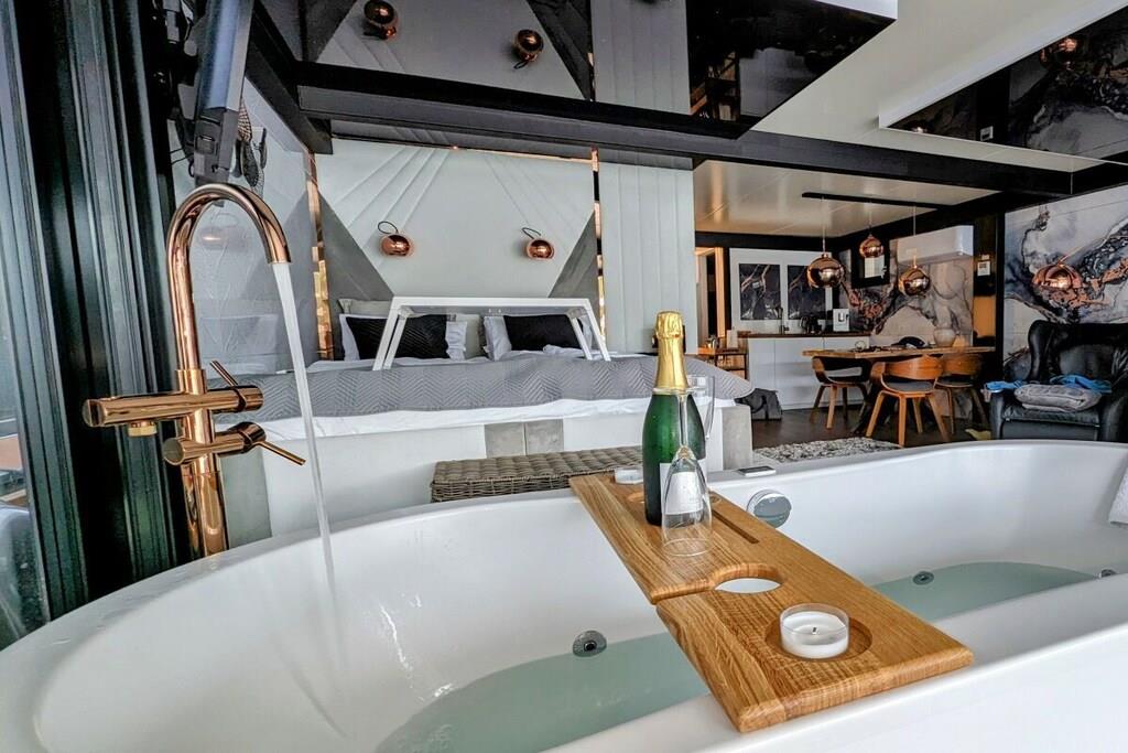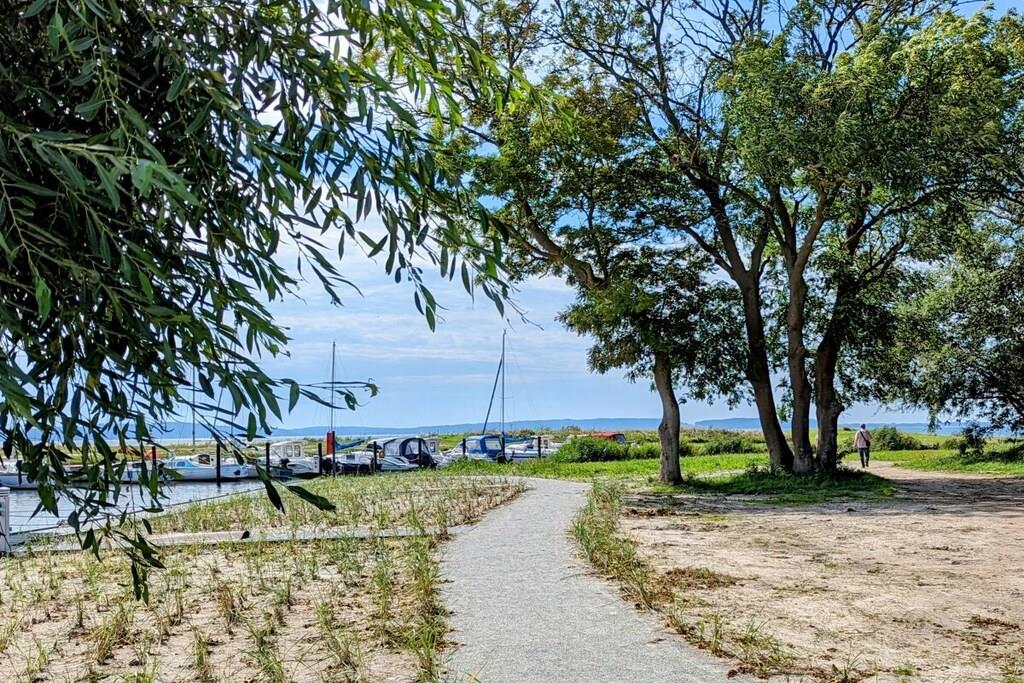 You can't get any closer to the water for a holiday. The idyllic and currently growing little harbor on the Jasmund Bodden – Martinshafen – is home to a unique, permanently moored houseboat with a suite-like atmosphere. From the bed, you can gaze through the large panoramic window across a whirlpool tub directly into the harbor, enjoying unparalleled views of nature and birdlife. A massage chair and a fireplace provide a special wellness experience. A small dry sauna and two bathrooms with large showers complete the luxurious amenities. A second, separate cabin offers an additional retreat. A refrigerator, sink, coffee maker, and toaster allow for self-catering. Breakfast can be ordered at the harbor bistro. Just around the corner, the beach invites you to enjoy water sports or simply relax and watch the waves.