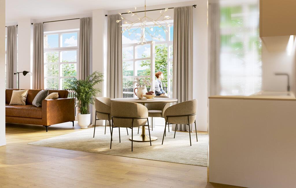 Die großen französischen Fenster in Ihrer Wohnung öffnen den Raum und schaffen eine ruhige, freundliche Atmosphäre. Entspannen Sie auf dem gemütlichen Sofa, lesen Sie ein Buch am modernen Kaminofen oder nutzen Sie den großzügigen Esstisch für gemeinsame Mahlzeiten. Durch die geschmackvolle Dekoration und die harmonische Farbgebung entsteht ein elegantes Ambiente, das zum Abschalten einlädt.