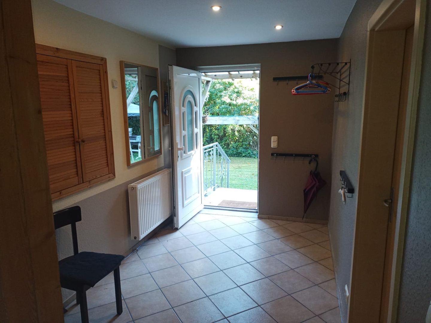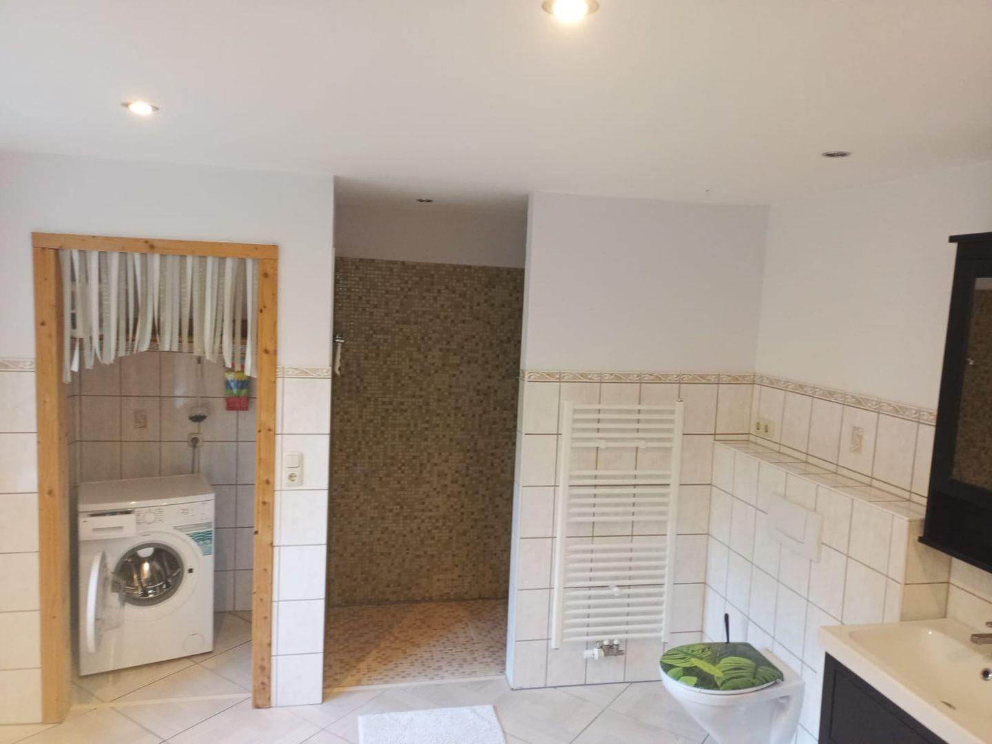 Das Badezimmer ist mit einer offenen Dusche, Waschbecken, großem Spiegel und selbstverständlich mit Fenster ausgestattet. Zusätzlich steht ein separates Gäste-WC zur Verfügung, um den Alltag mehrerer Gäste zu erleichtern. In allen Räumen sorgt die Zentralheizung für angenehme Temperaturen und Rauchmelder garantieren Sicherheit für alle Bewohner.