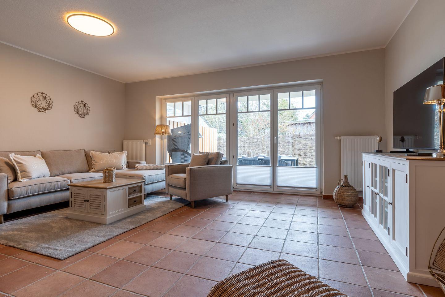 Das Wohnzimmer bietet zudem einen Fernseher, ein Radio und kostenloses WLAN, sodass Sie auch während Ihres Urlaubs mit der digitalen Welt verbunden bleiben können. Bei schönem Wetter laden die überdachte Terrasse und der Balkon mit Gartenmöbeln zu entspannenden Stunden im Freien ein.