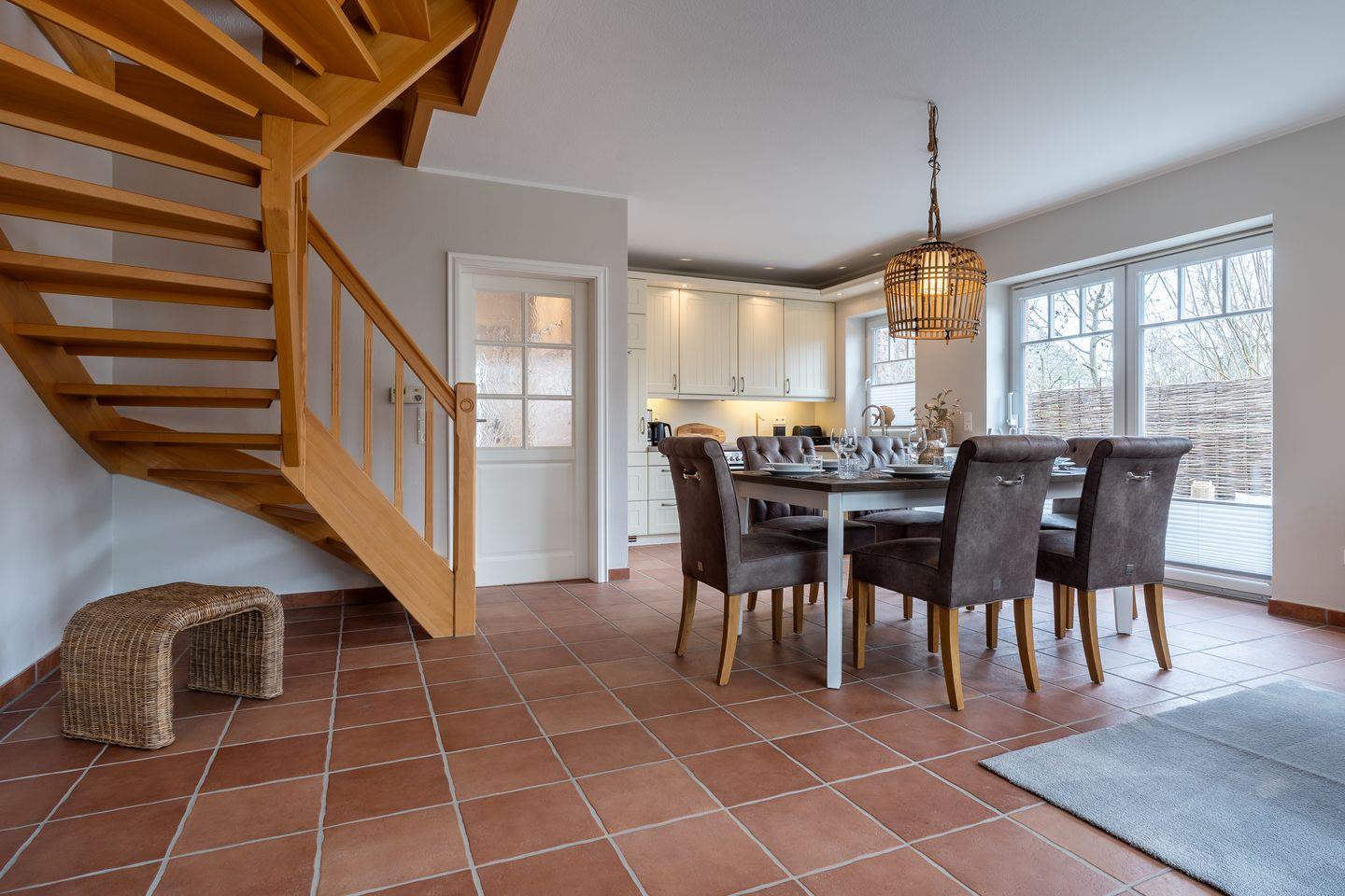 Die Unterkunft verfügt über insgesamt 4 Zimmer, darunter 3 Schlafzimmer, die viel Platz und Privatsphäre bieten. Im Parterre genießen Sie eine offene Küche, die mit modernen Annehmlichkeiten ausgestattet ist, darunter ein Cerankochfeld, Backofen, Kühlschrank mit Gefrierfach und Geschirrspüler. Die Küchenutensilien sind vollständig vorhanden, sodass Sie Ihre Lieblingsgerichte zubereiten können. Ein gemütlicher Essbereich verbindet die Küche mit dem Wohnzimmer.
