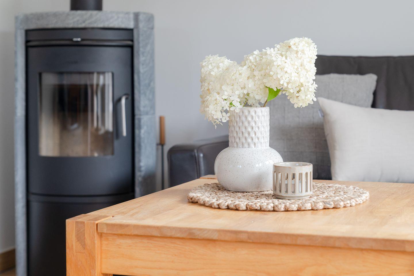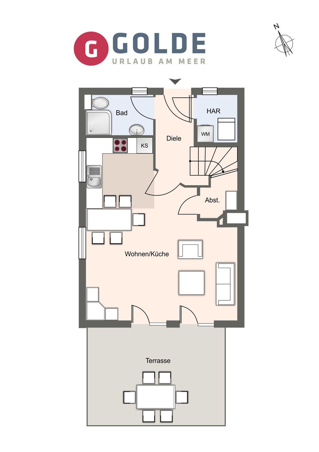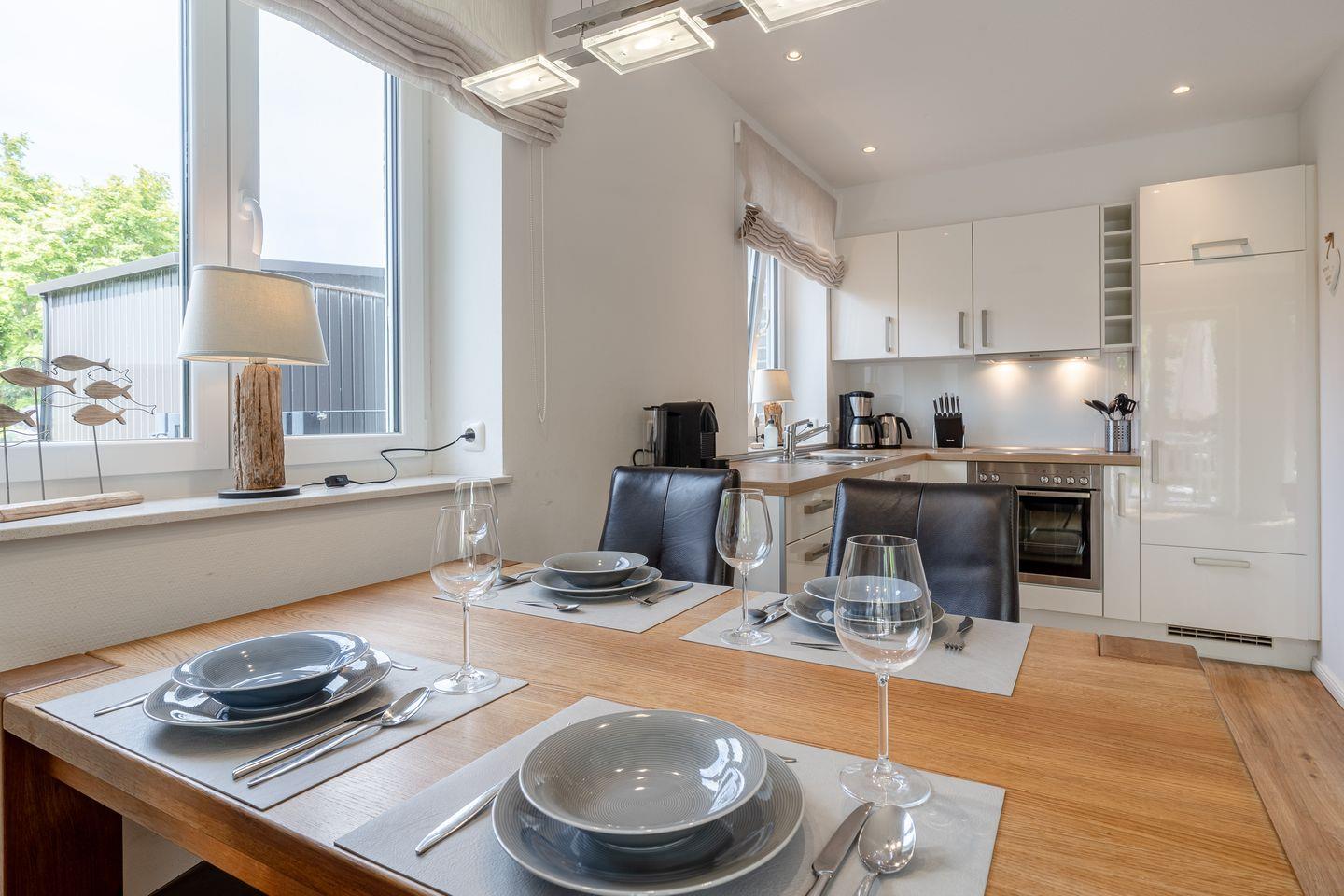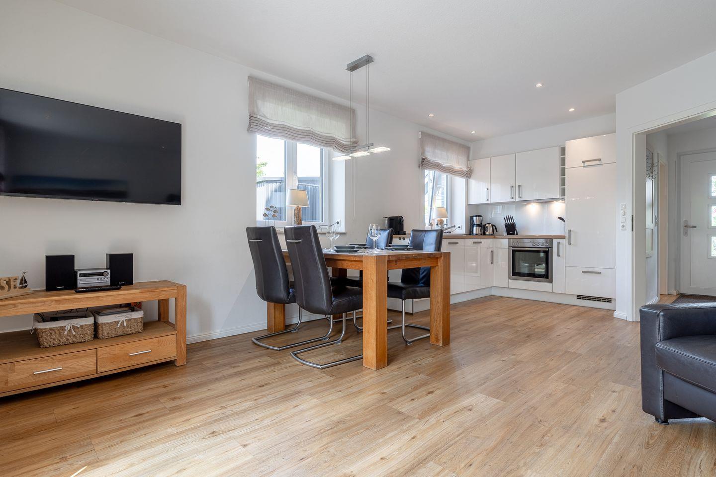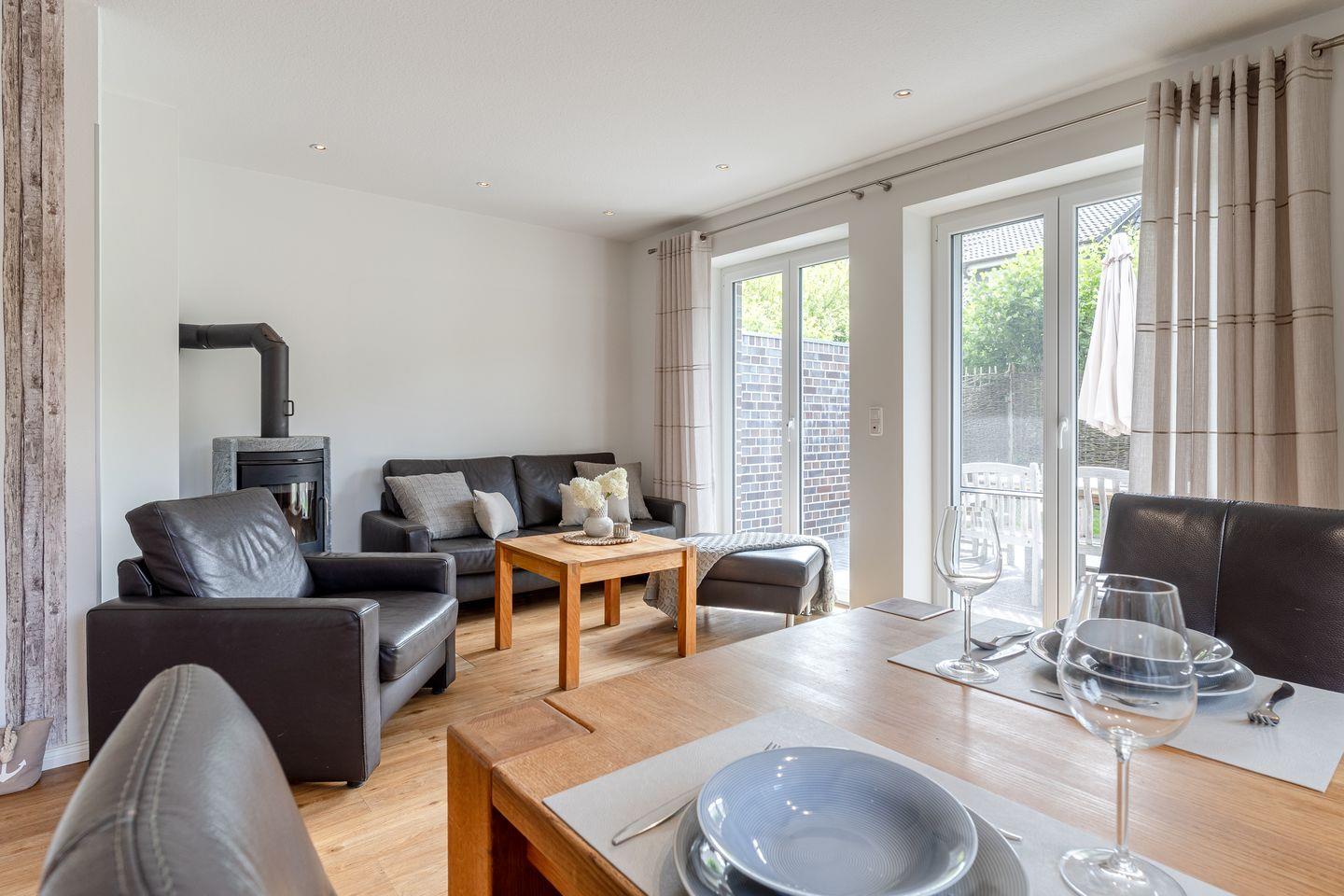 Im Erdgeschoss erwartet Sie ein Wohn- und Essbereich mit einem einladenden Specksteinofen und einer modernen offenen Küche. Zusätzlich verfügt das Erdgeschoss über ein Gästebad mit einer ebenerdigen Dusche. Von hier aus können Sie direkt auf die sonnige Süd-Terrasse treten, die mit edlen Gartenmöbeln aus Teak-Holz ausgestattet ist – der perfekte Ort, um die Sonne zu genießen.