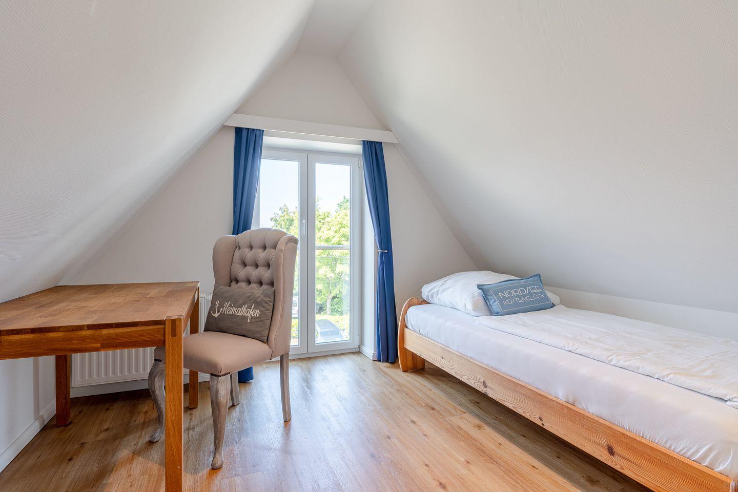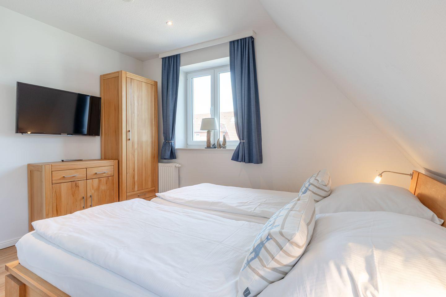 Im ersten Obergeschoss erwarten Sie zwei gemütliche Schlafzimmer mit Verdunklungsvorhängen sowie ein geräumiges Badezimmer mit Dusche und Fußbodenheizung für höchsten Komfort. Im zweiten Obergeschoss finden Sie einen weiteren Raum, der ideal als zusätzliches Schlafzimmer genutzt werden kann. Ausgestattet ist das Haus mit einem Smart-TV und einem weiteren Fernseher im großen Schlafzimmer sowie WLAN und Insektenschutzgittern für ungestörte Nächte.