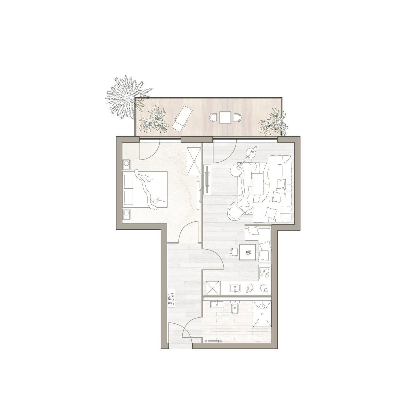 Der möblierte Balkon lädt zu einem Frühstück in der Sonne ein. Das Schlafzimmer ist mit einem komfortablen Doppelbett, Schrank und Smart TV ausgestattet. Ein Plus: der direkte Zugang zum Balkon! Zudem verfügt das Apartment über ein modernes, mit Natursteinfliesen gestaltetes Badezimmer.