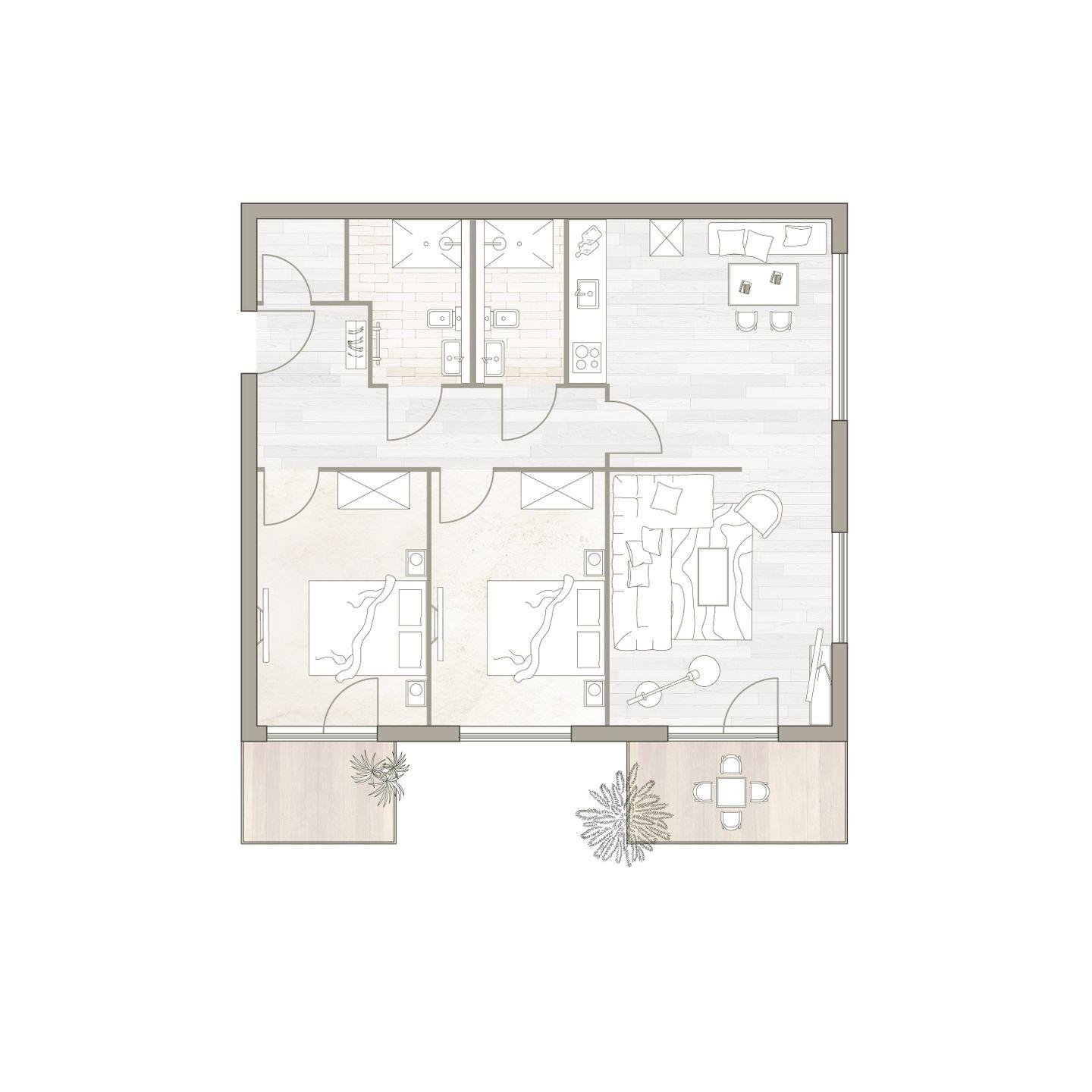 Die zwei Schlafzimmer sind mit je einem komfortablen Doppelbett, Schrank und Smart TV ausgestattet. Ein Plus: ein zweiter Balkon am vorderen Zimmer. Zudem verfügt das Apartment über ein stilvolles Badezimmer, ein WC und einen Abstellraum.