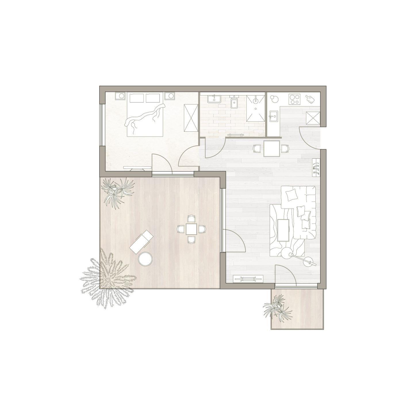 Der offen gestaltete Wohn-Essbereich mit integrierter Küche wird von zwei Seiten mit Tageslicht durchflutet. Der kleine Essplatz ist ein Ort zum Zusammensein ebenso wie die gemütliche Sofaecke in hellem Naturton. Eine große, möblierte Dachterrasse und ein separater Balkon bieten Sonne bis in den Abend hinein. Das Schlafzimmer ist mit einem komfortablen Doppelbett, Schrank und Smart TV ausgestattet. Zudem verfügt das Apartment über ein modernes, mit anthrazitfarbenen Natursteinfliesen gestaltetes Badezimmer.