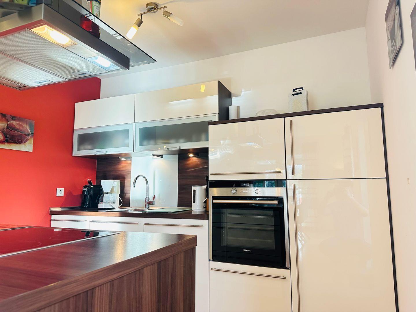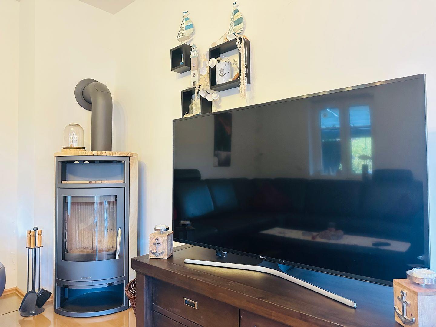 Im offenen Wohn- und Essbereich erwartet Sie eine moderne Küche mit Kochinsel, ausgestattet mit Nespresso- und Filterkaffeemaschine, Toaster, Backofen sowie einem Kühlschrank mit Gefrierfach – ideal für gemeinsame Kochmomente. Der angrenzende Wohnbereich lädt mit einem großen Sofa, Kamin und Fernseher zu entspannten Abenden ein.