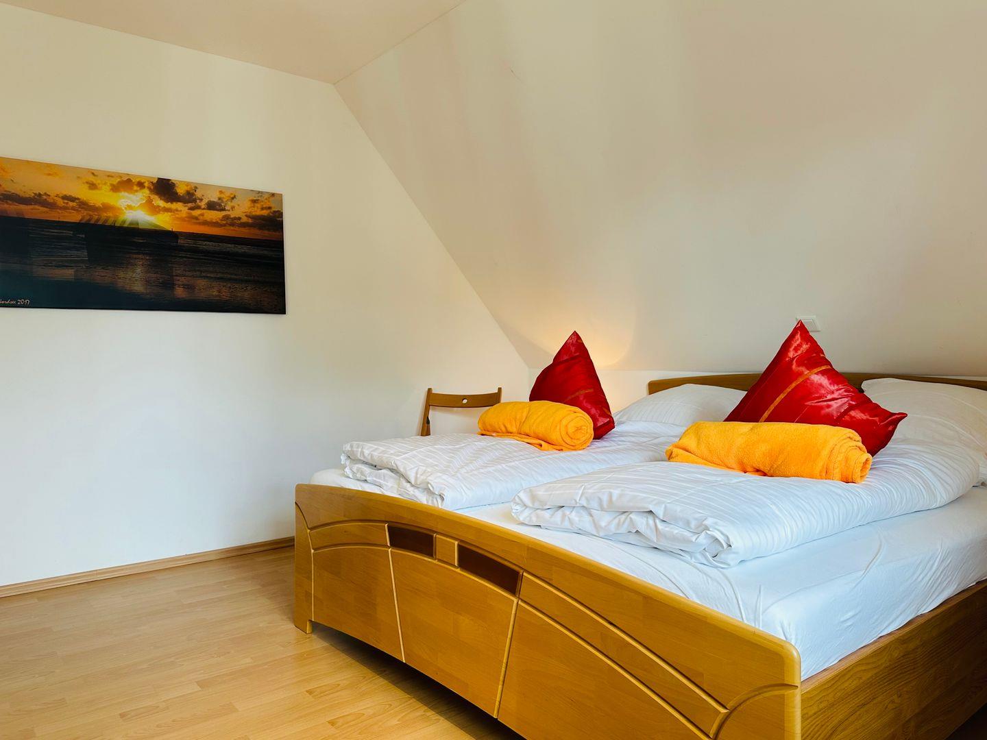 Im Obergeschoss befindet sich ein Schlafzimmer mit Fernseher und Kleiderschrank.