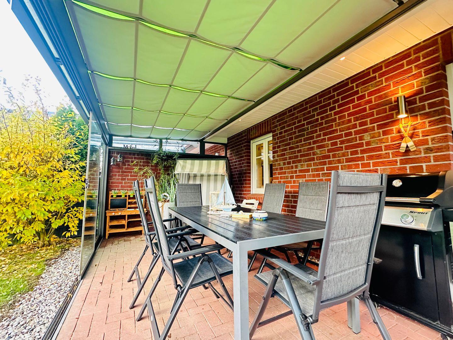 Ein besonderes Highlight ist der lichtdurchflutete Wintergarten mit Südwest-Ausrichtung. Hier genießen Sie auf dem großzügigen Sitzbereich oder im Strandkorb die Sonne – perfekt, um den Tag bei einer Tasse Kaffee oder einem Glas Wein ausklingen zu lassen.