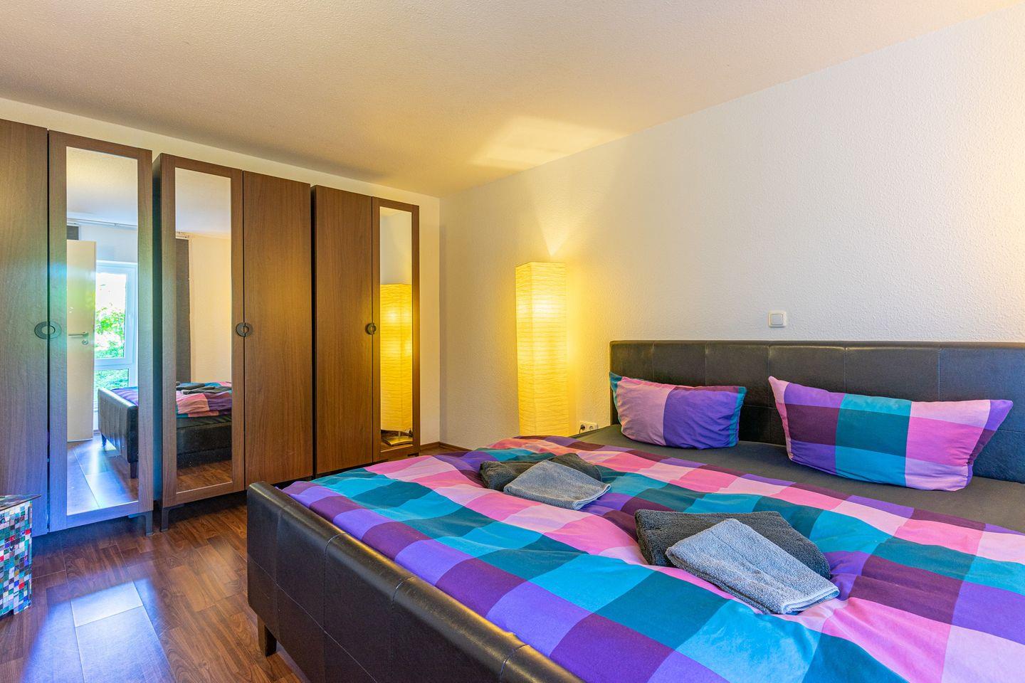 Im Schlafzimmer gibt es ein großes Doppelbett (180/200 cm) sowie drei Kleiderschränke mit Ganzkörperspiegeln.