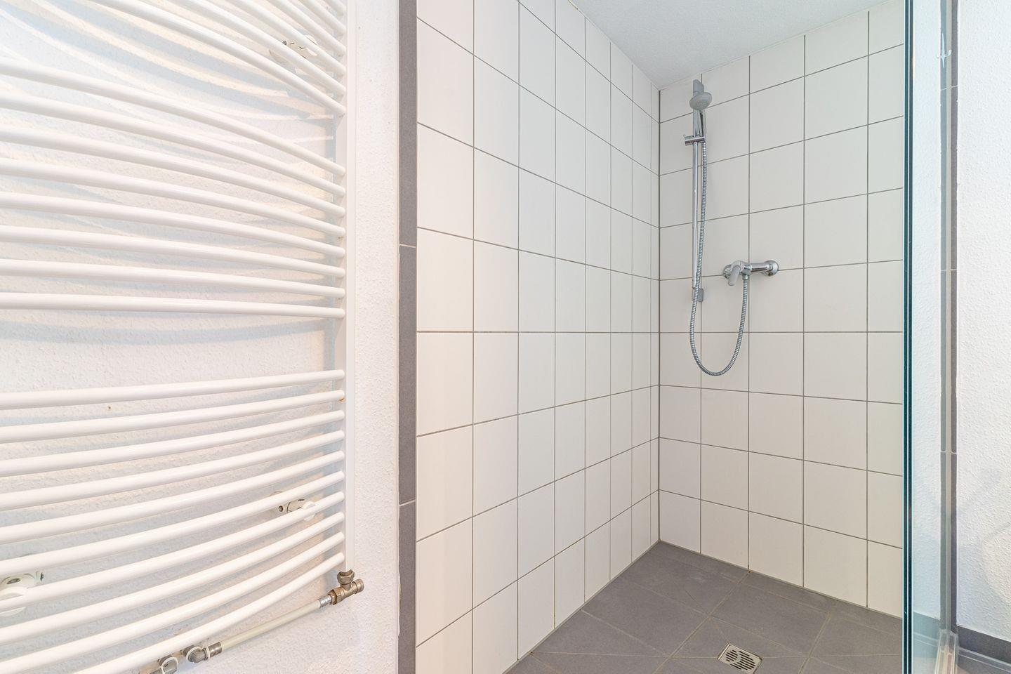 Das großzügige Badezimmer mit Tageslicht verfügt über eine sehr geräumige, ebenerdige Glasdusche sowie über ein WC und Waschtisch.