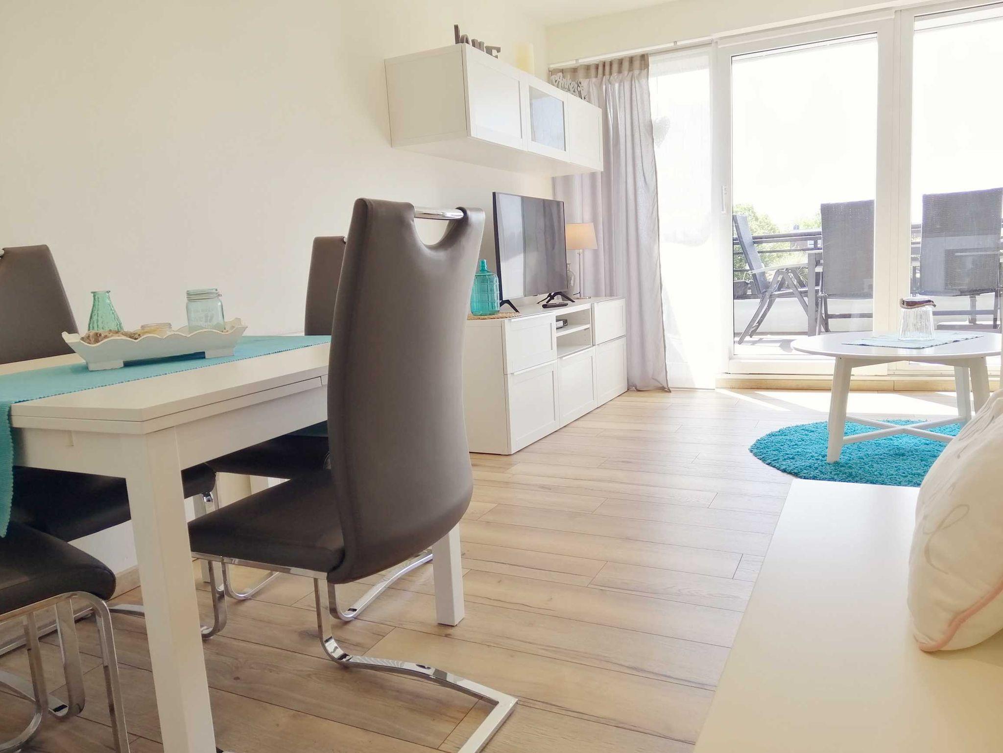Der hell und freundlich eingerichtete Wohnraum verfügt über einen Essplatz für 4 Personen, eine offene vollausgestattete Küche mit einem Backofen, Kochfeld mit zwei Feldern, Mikrowelle sowie einem Kühlschrank mit Gefrierfach, Filter-Kaffeemaschine sowie Senseo-Pad-Maschine, Toaster und Wasserkocher. Dem Wohnbereich mit Schlafsofa und Fernseher schließt sich der sonnige Balkon an.