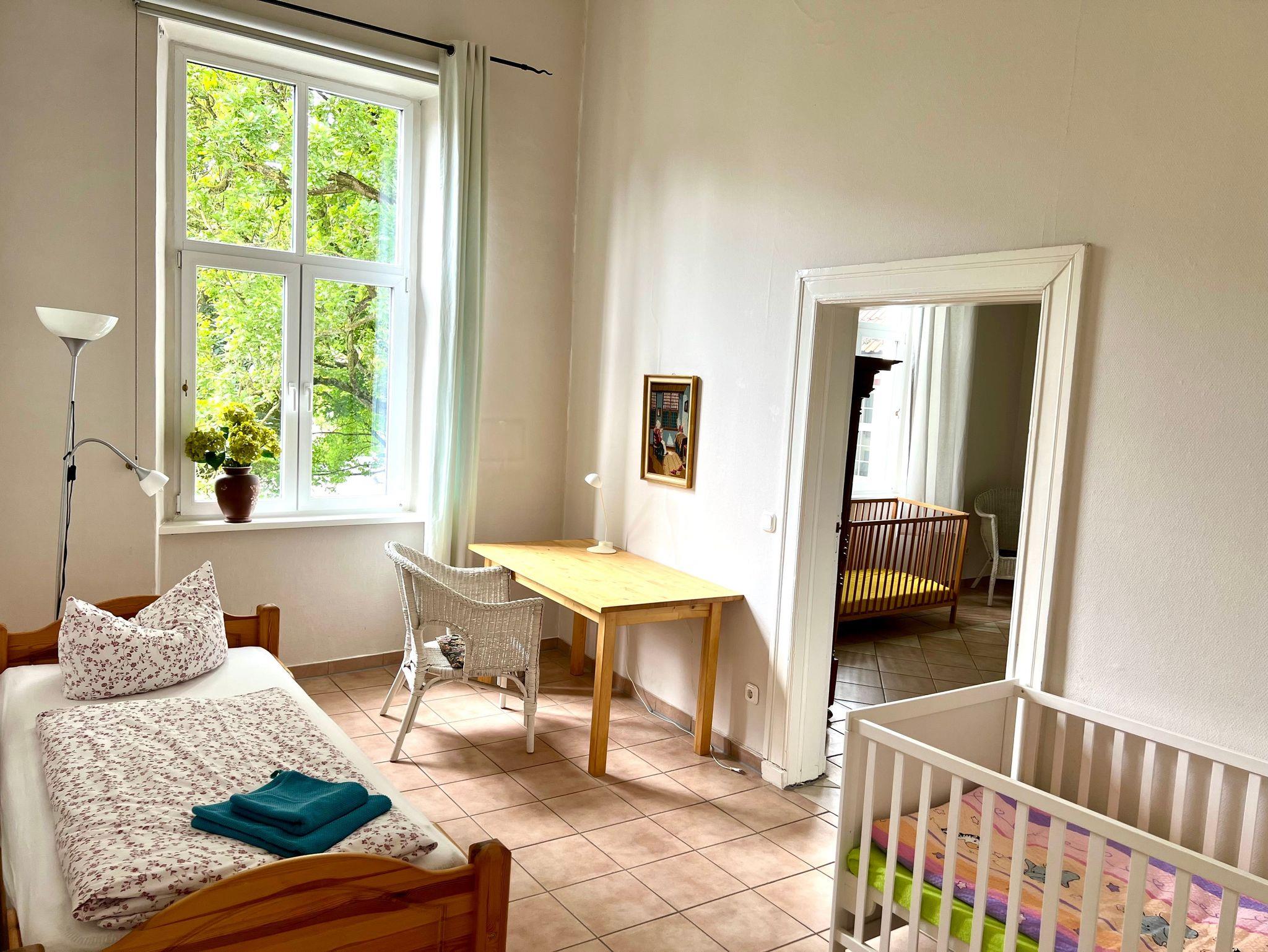 1 Schlafzimmer mit einem Einzelbett und einem Kinderbett (Durchgangszimmer) zum