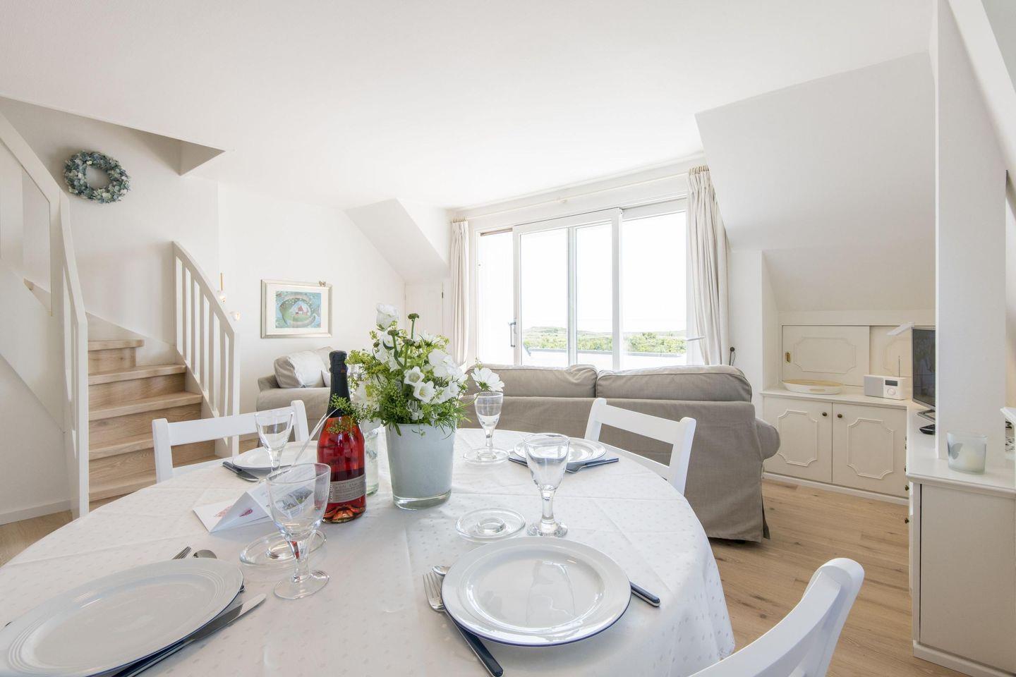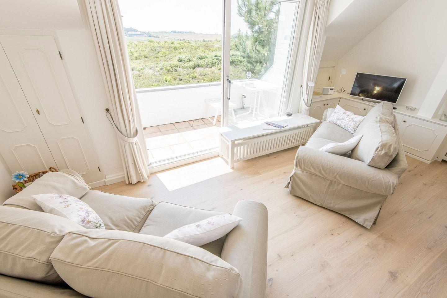 Das gemütliche Wohnzimmer ist der perfekte Ort zum Entspannen. Ob auf dem komfortablen Sofa mit einem guten Buch oder bei einem gemeinsamen Filmabend – hier lässt es sich wunderbar abschalten. Der angrenzende Essbereich mit Platz für 4 Personen lädt zu gemeinsamen Mahlzeiten ein, während die offene Gestaltung ein luftiges Raumgefühl schafft. Der direkte Zugang zum Balkon mit freiem Blick aufs Wattenmeer ermöglicht es, die Ruhe der Natur zu genießen und den Alltag hinter sich zu lassen.
