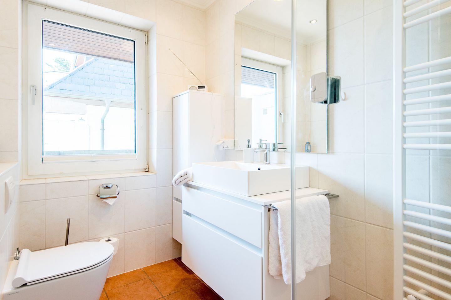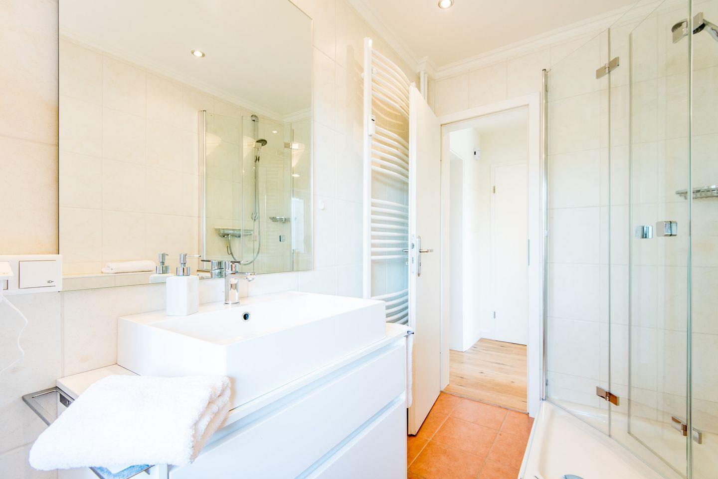 Das Badezimmer überzeugt mit einer geräumigen Dusche, einem großen Spiegel und einem Handtuchheizkörper. Hier können Sie den Tag entspannt beginnen oder nach einem Strandtag abschließen.