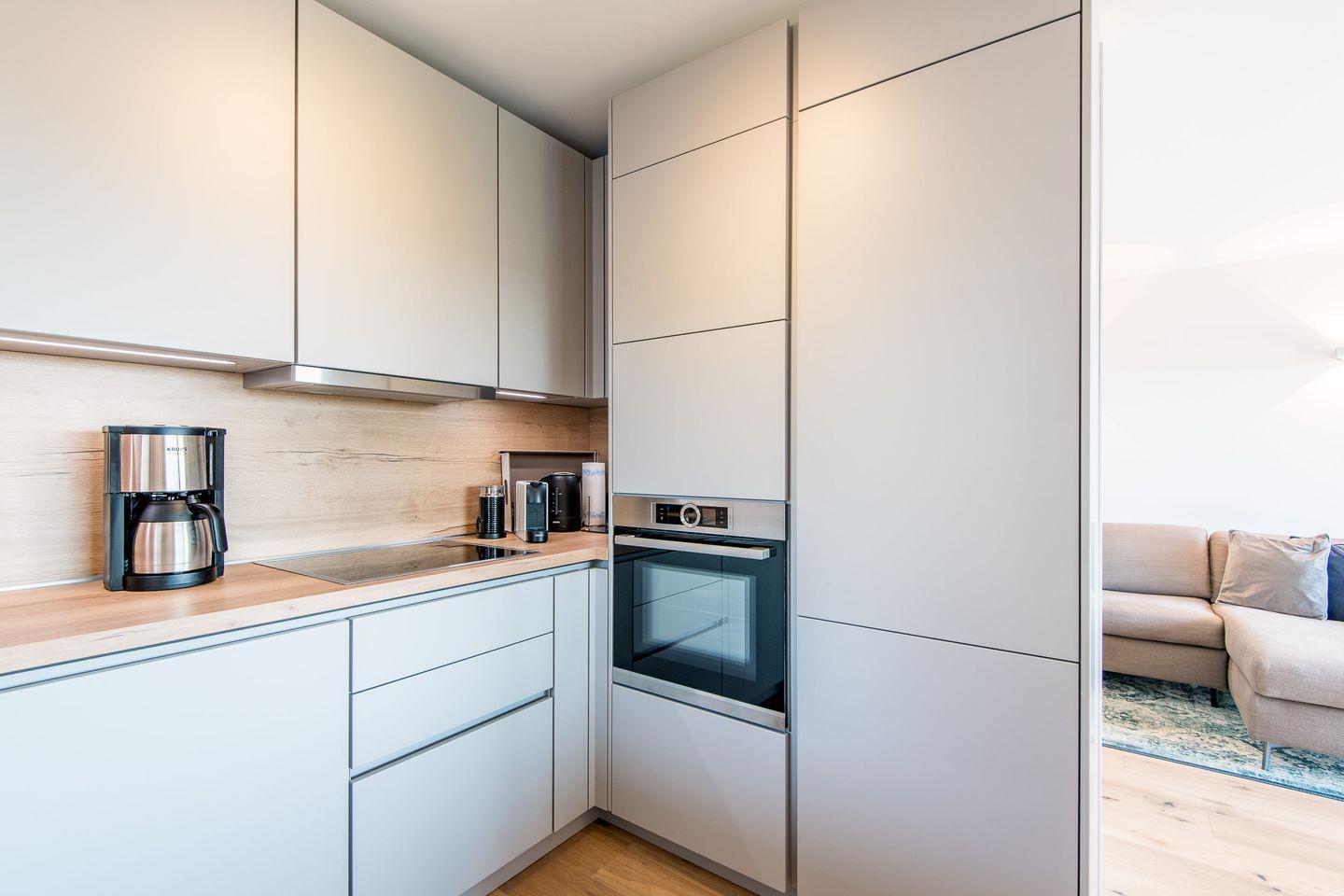 Die offene und komplett neue Küche ist hochwertig ausgestattet und lässt keine Wünsche offen. Mit Ceranfeld, Geschirrspüler und weiteren modernen Annehmlichkeiten steht Ihnen alles zur Verfügung, um Ihre Lieblingsgerichte in stilvollem Ambiente zuzubereiten.