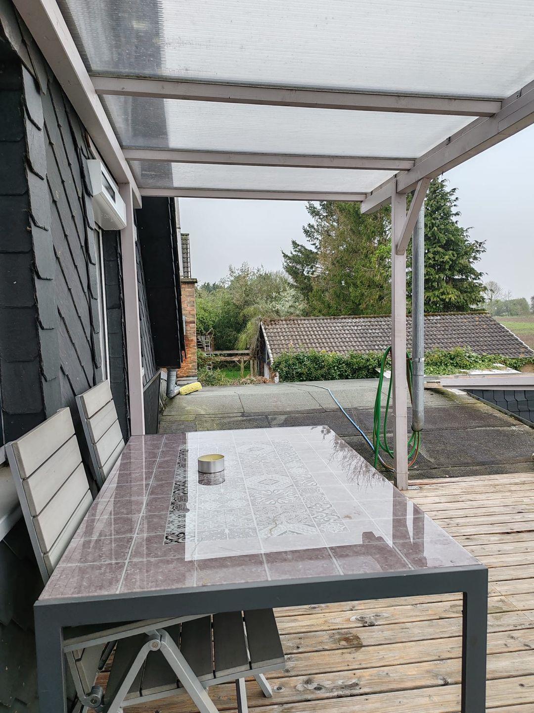 Genießen Sie die Sonne auf dem überdachten Balkon mit zwei Sonnenliegen, Gartenmöbeln und Sonnenschirm – perfekt für entspannte Stunden im Freien.