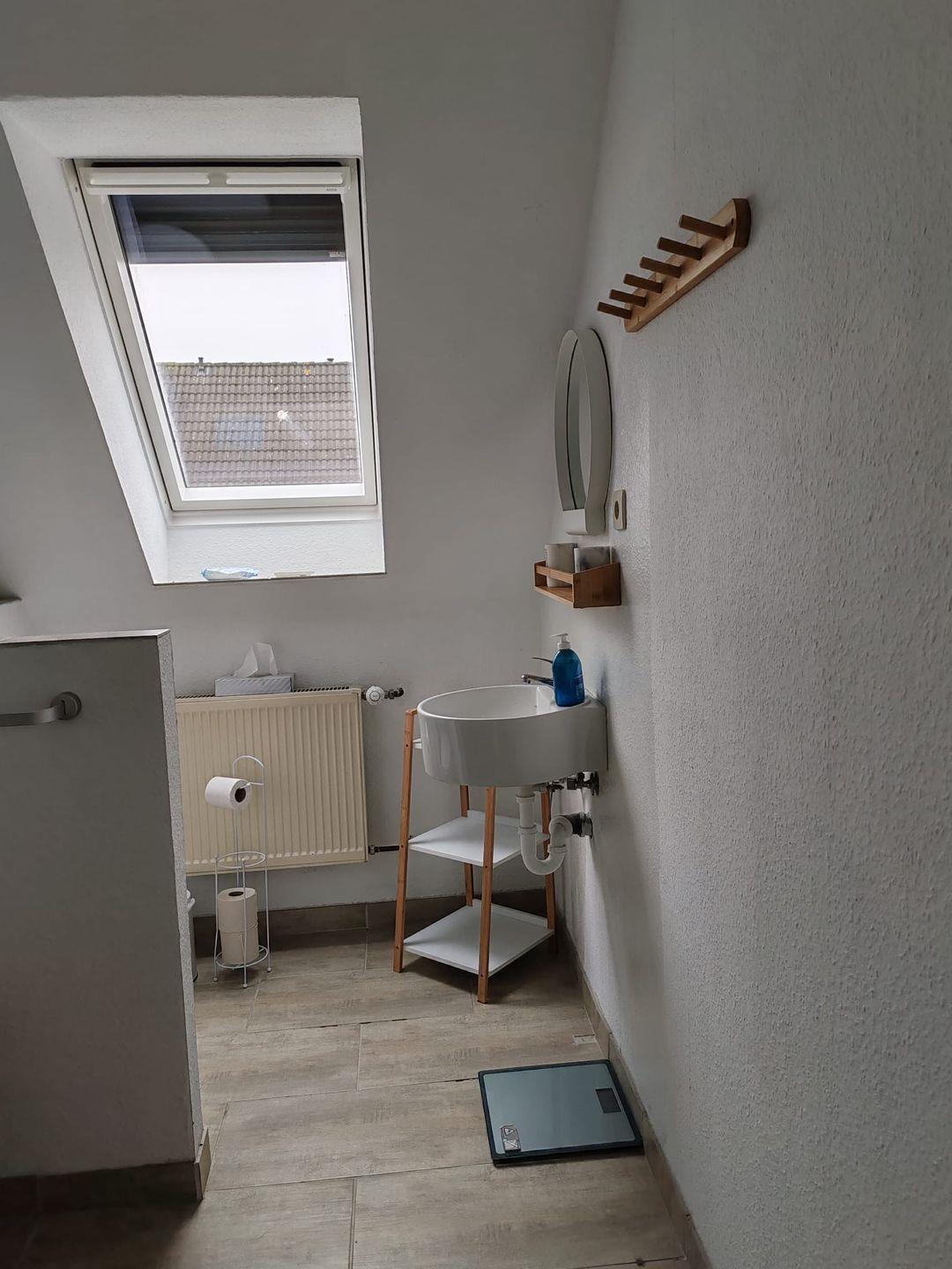 Badezimmer: Modern ausgestattet mit Dusche, WC, Waschbecken, Ganzkörperspiegel, Haartrockner und Fenster.