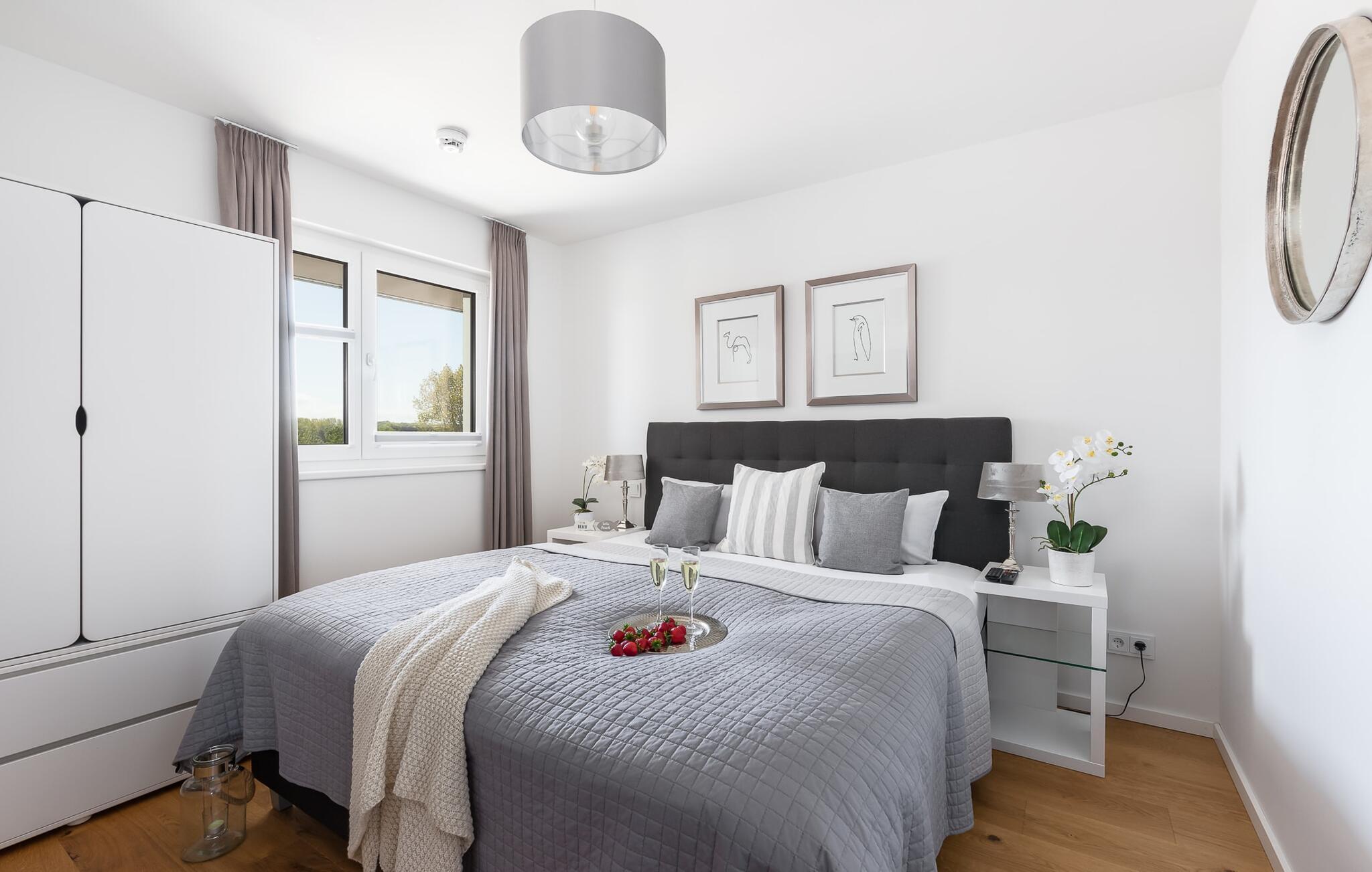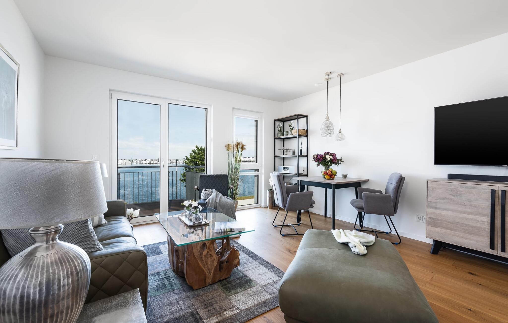 Tretet ihr hinaus auf den angrenzenden Balkon, werdet ihr überwältigt sein. Ein phänomenaler Weitblick über den vor euch liegenden Segel- und Sportboothafen, die schwimmenden Häuser und die Schlei präsentiert sich euch. Wahrhaft fantastisch! Und sollte das Wetter ein draußen sitzen einmal nicht zulassen, könnt ihr das Hafenkino dank der bodentiefen Fenster auch entspannt von drinnen genießen.