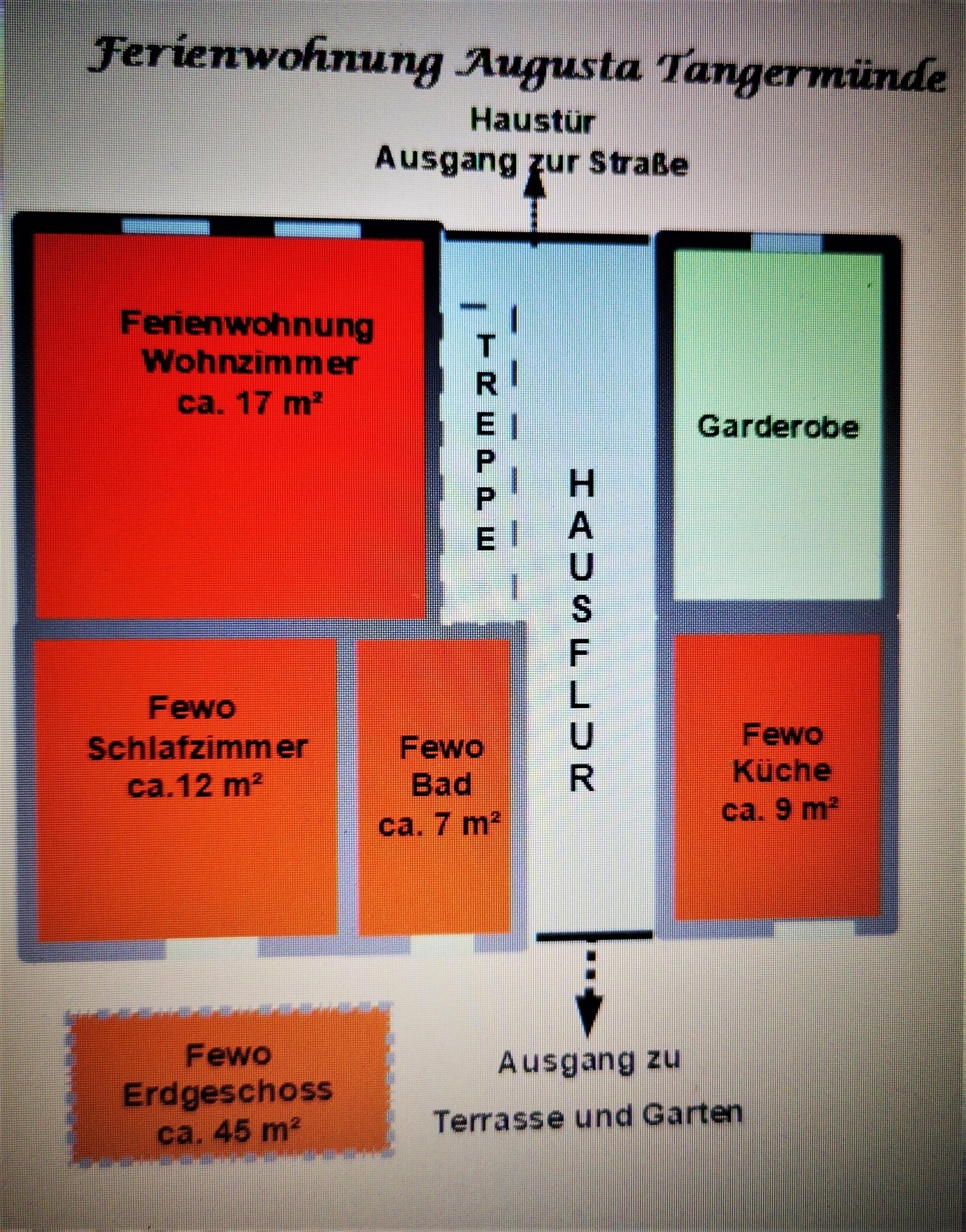 Die Fewo "Augusta" bietet Ihnen im Erdgeschoss auf ca. 45 m² : Wohnzimmer, Schlafzimmer, Duschbad und eingerichtete Küche für einen angenehmen Aufenthalt.