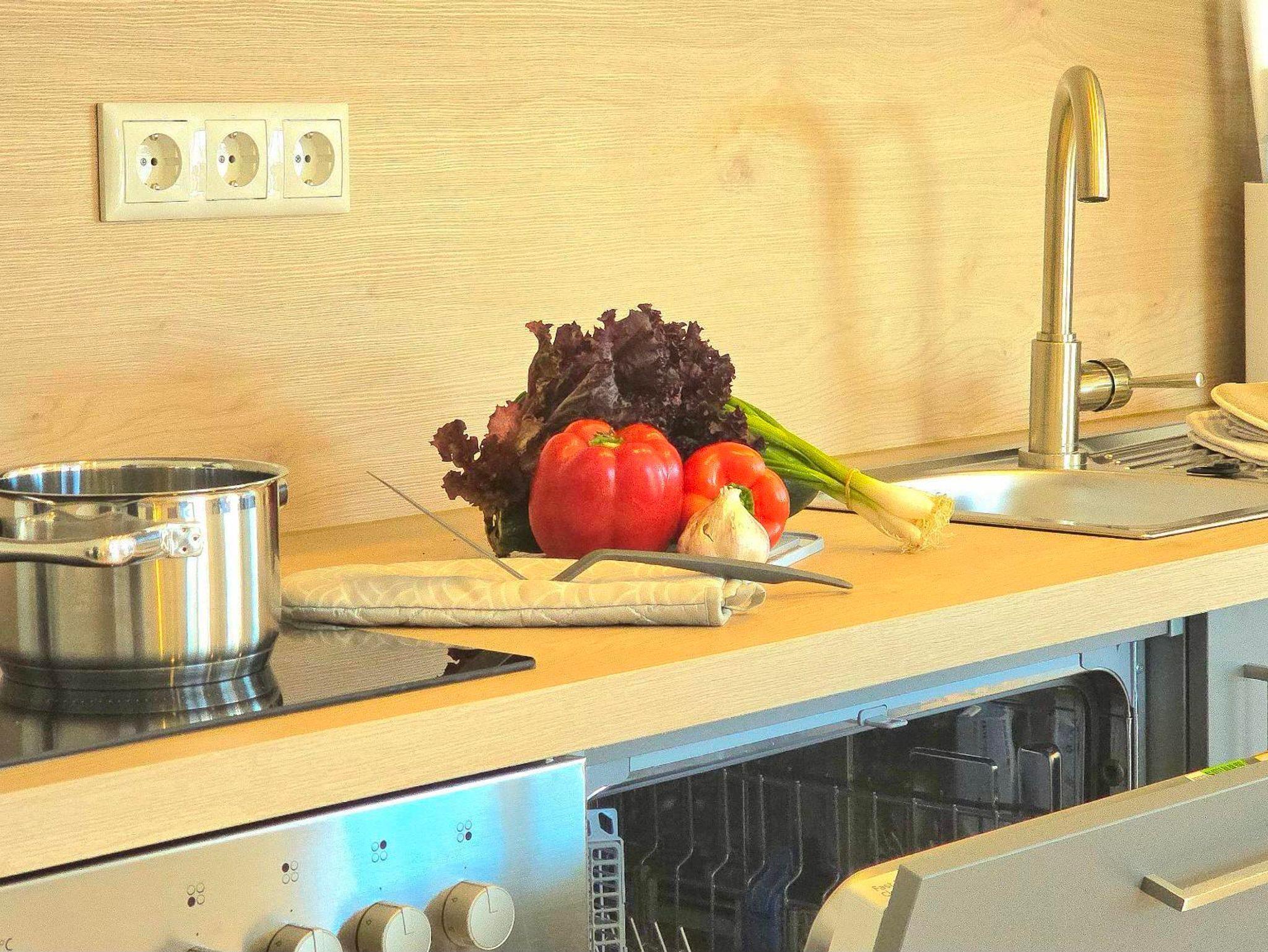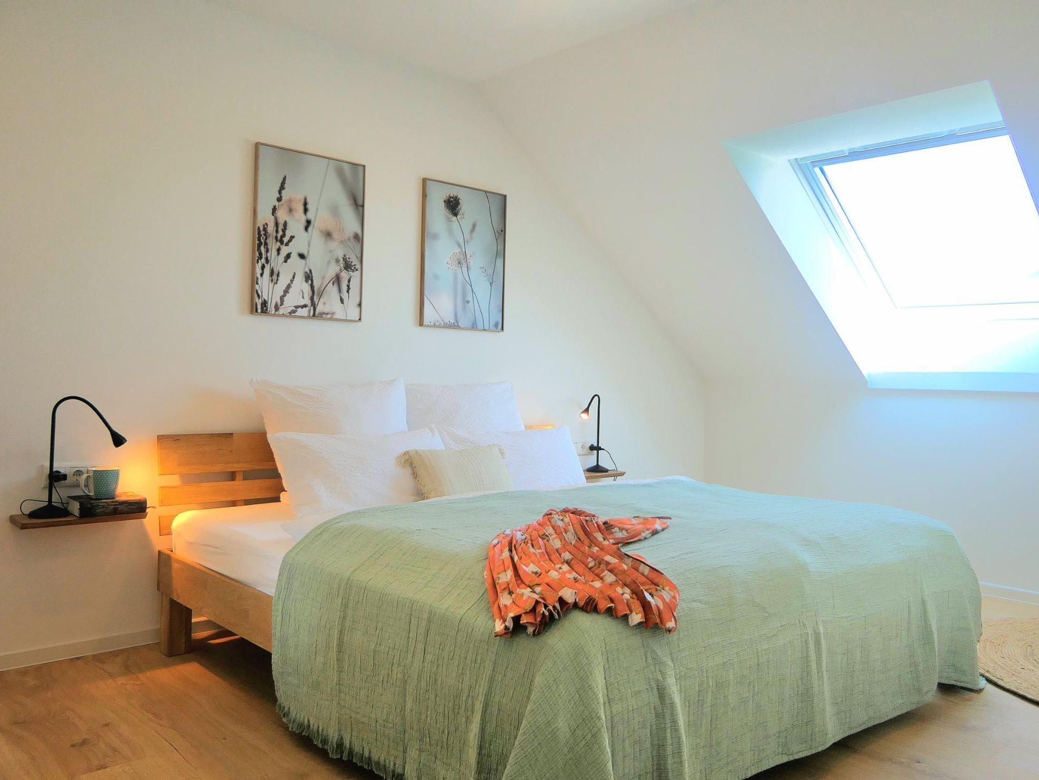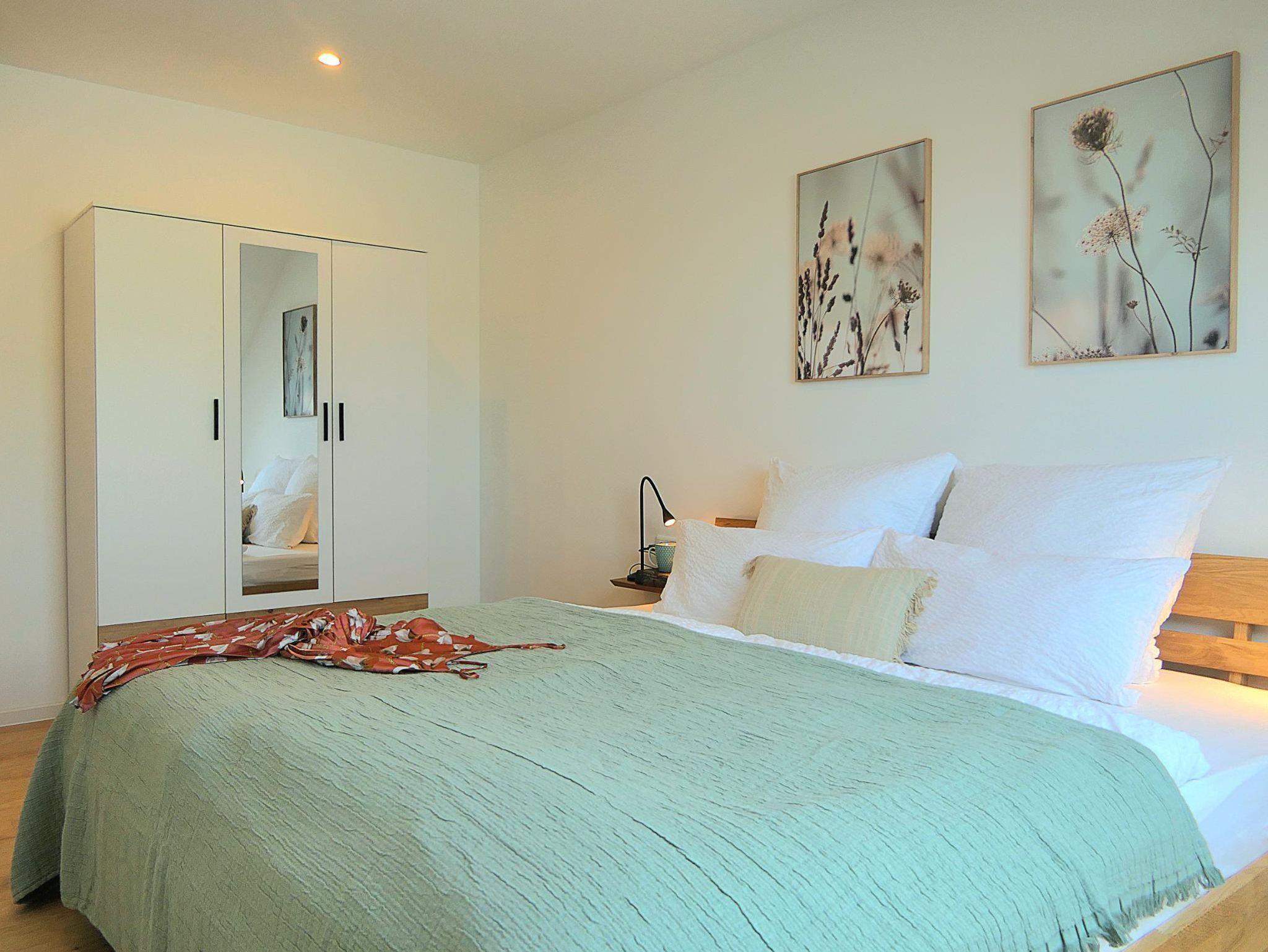Gemütliche 70?m² große Ferienwohnung mit 1 Schlafzimmer, 1 komfortables Bad mit Regenwalddusche sowie einem großzügigen Wohn-Essbereich mit offener Küche. Das Schlafzimmer ist mit einem komfortablen Doppelbett (200×200?cm, ohne Fußteil) ausgestattet. Im Wohnbereich stehen zwei Schlafcouches für je eine Person zur Verfügung – ideal für Familien oder kleine Gruppen.