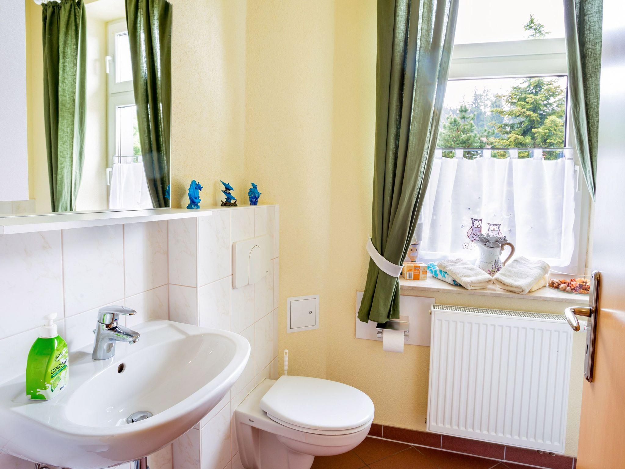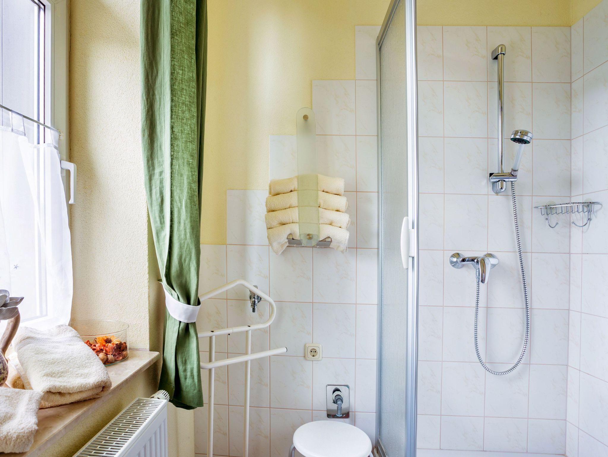 Das helle Badezimmer verfügt über ein Tageslichtfenster und eine Dusche.