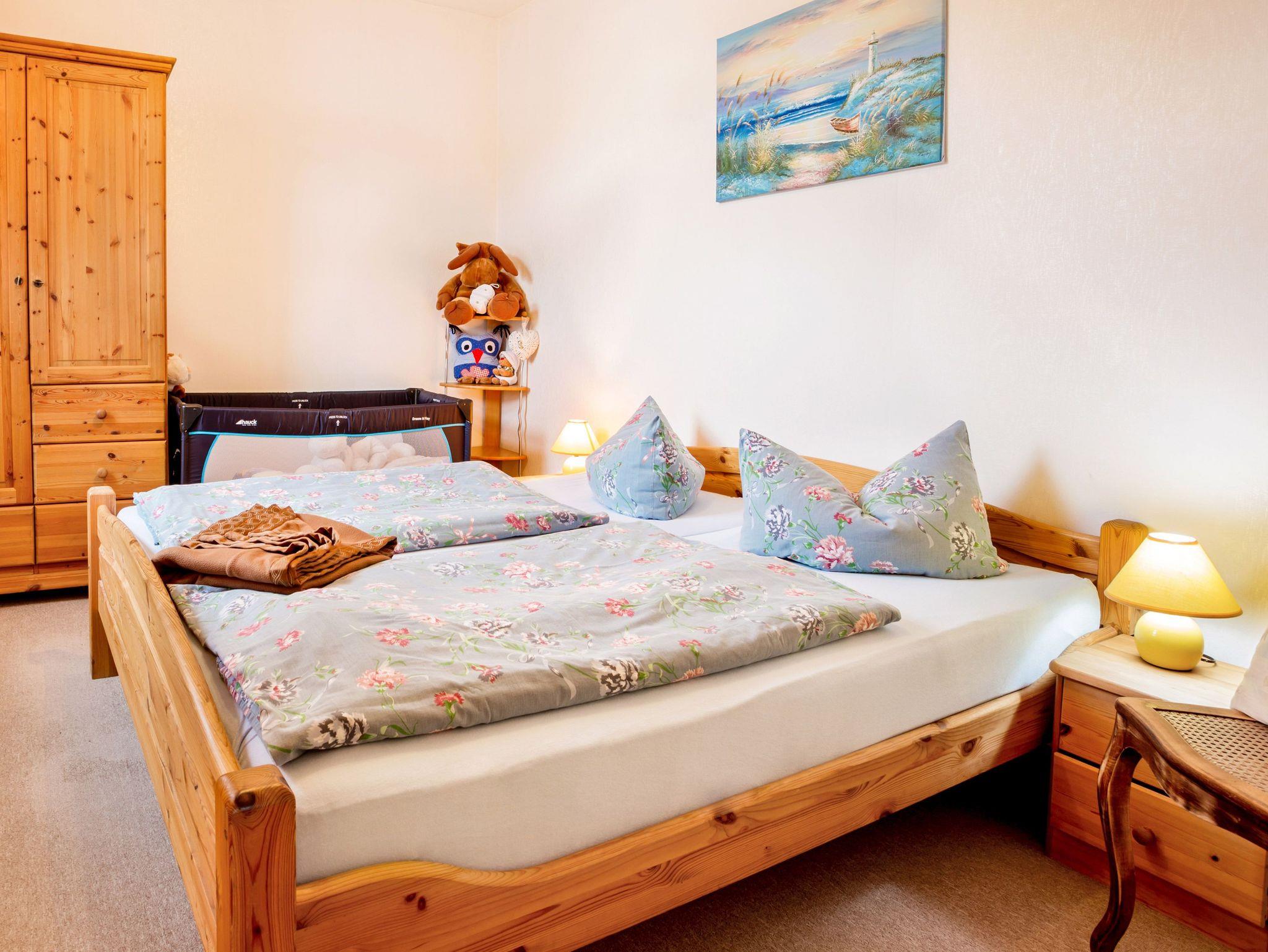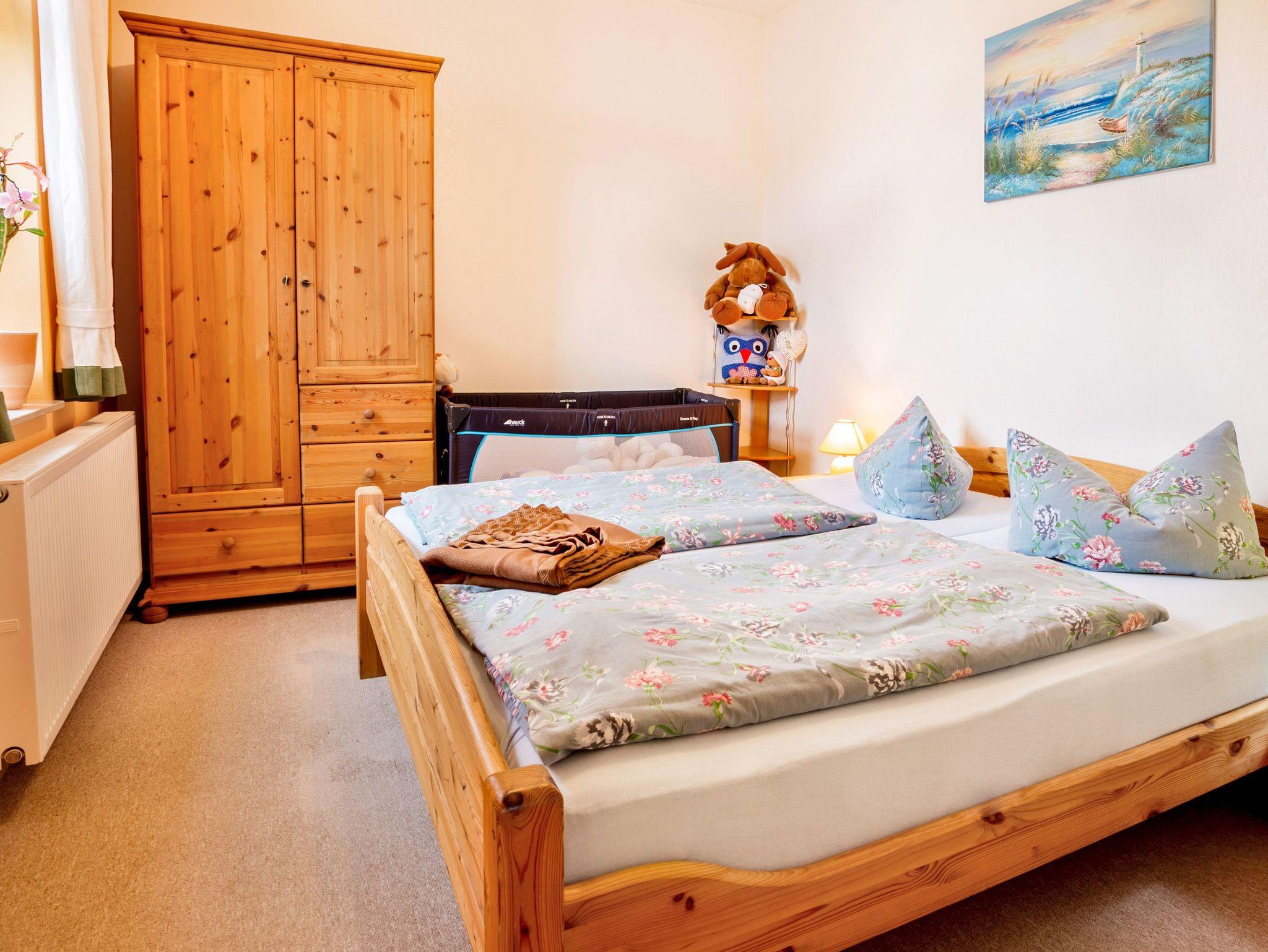 Willkommen in der 2-Raum-Ferienwohnung Gartenblick! Auf großzügigen 60 qm erwartet Sie ein separater Schlafbereich mit einem Doppelbett (1,80 x 2,00 m) und einem Babybett, ideal für Familien mit Kleinkindern.