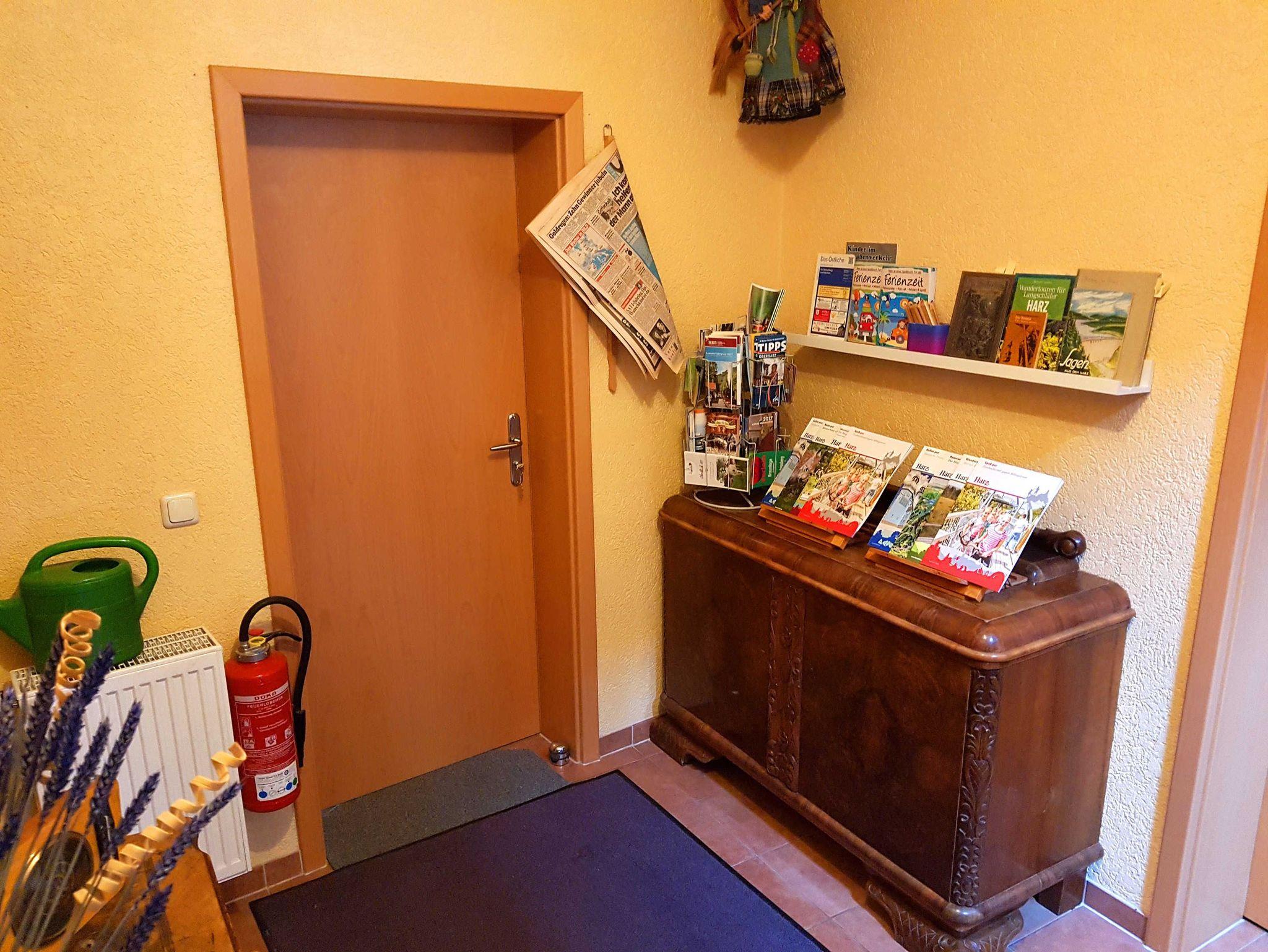 Im Flurbereich des 1. Obergeschosses finden Sie eine Informationsecke mit diversen Prospekten sowie eine kleine „Minibar“ mit käuflich zu erwerbenden Produkten wie Sekt und Wein.