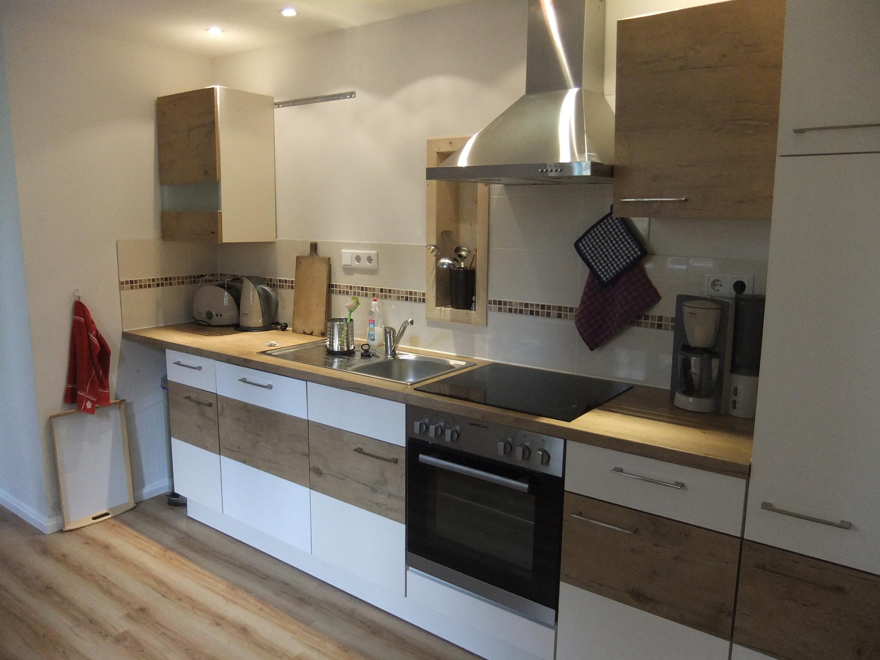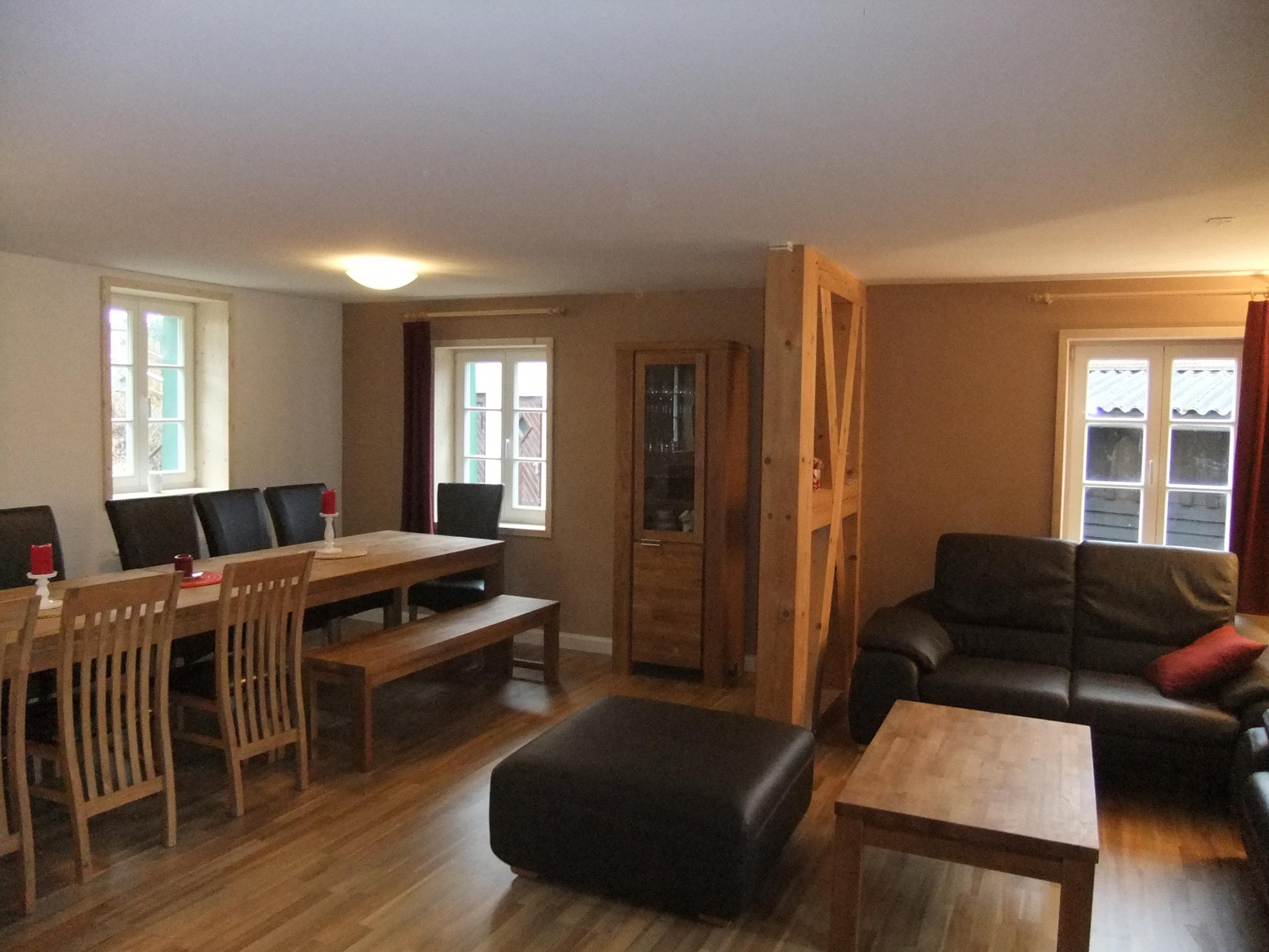 Im Erdgeschoss befindet sich das große helle Wohnzimmer mit Kamin , Fernseher, Sitzecke und Esstisch (14 Personen). Hier schließt sich die neue Küche mit Gschirrspüler, Backofen, 4 Heizplatten, Toaster Kaffeemaschine, Wasserkocher, Geschirr u.a an.