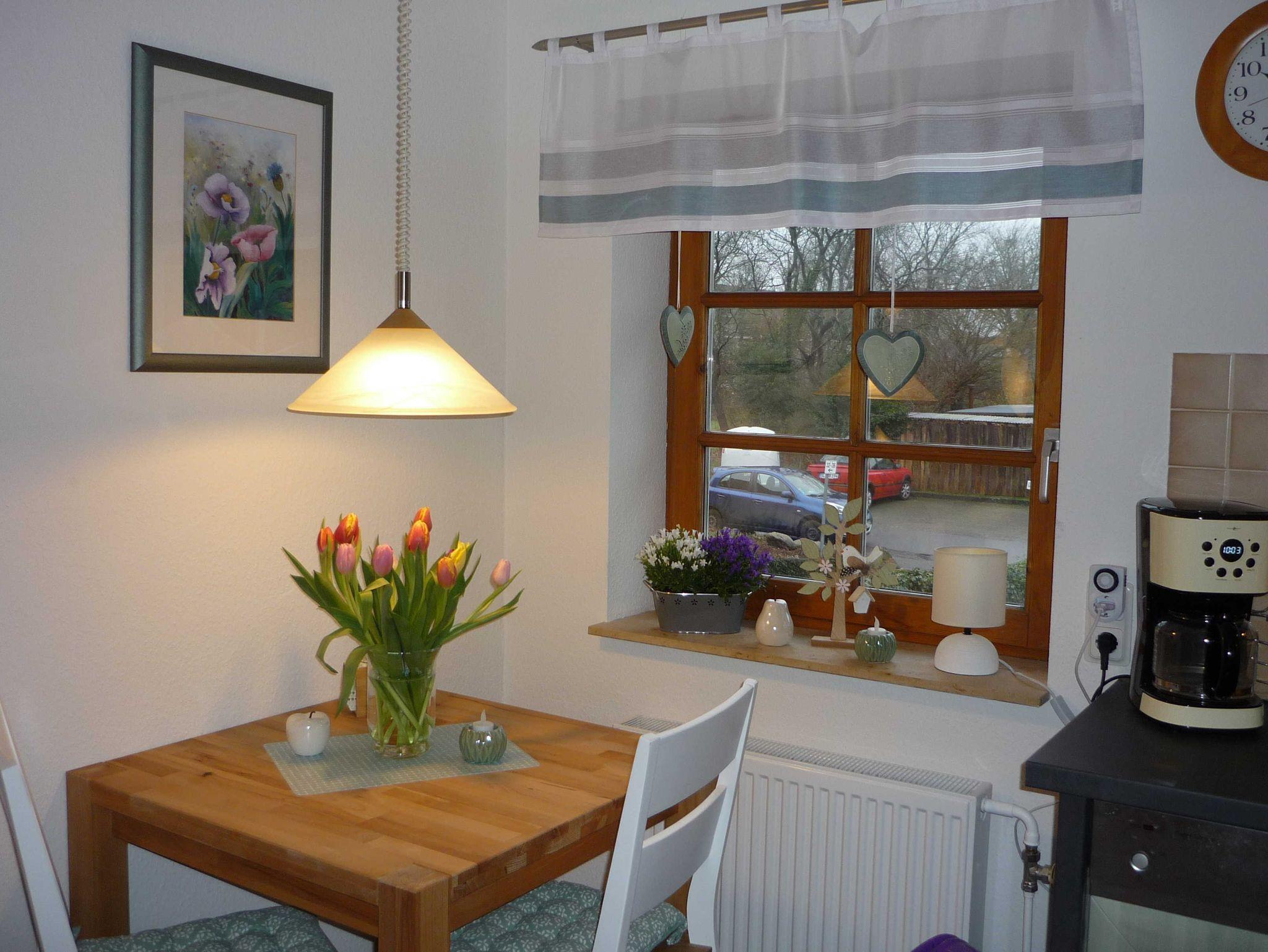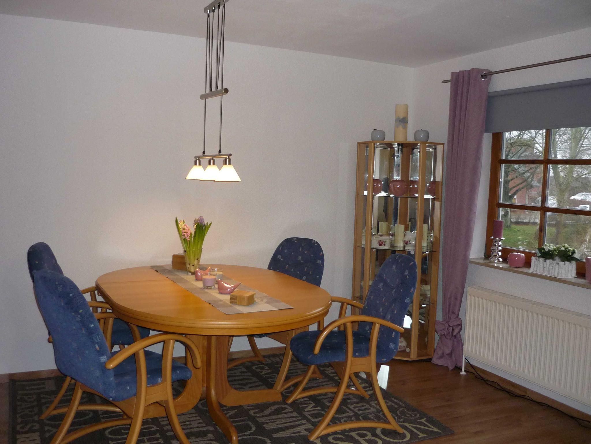 Die gemütliche Wohnung im Obergeschoss hat zwei Schlafzimmer: ein Schlafzimmer mit einem großen Doppeltbett und Platz für ein Kinderbett (vorhanden) und ein Schlafzimmer mit einem Einzelbett, TV und Sofa plus Sofatisch. Das Sofa kann als Schlafsofa genutzt werden. Das Wohnzimmer hat eine Sofaecke mit 3-Sitzer, 2-Sitzer und einem Sessel sowie einen Esstisch. Die Küche hat ebenso einen Essbereich uns ist bestens ausgestattet mit Geschirrspüler, Mikrowelle und allem Zubehör für das Zubereiten einer leckeren Urlaubsküche. Das Tageslichtbad hat eine Dusche. Den Gästen steht ein PKW-Stellplatz im Carport und ein Grill im Garten zur Verfügung.