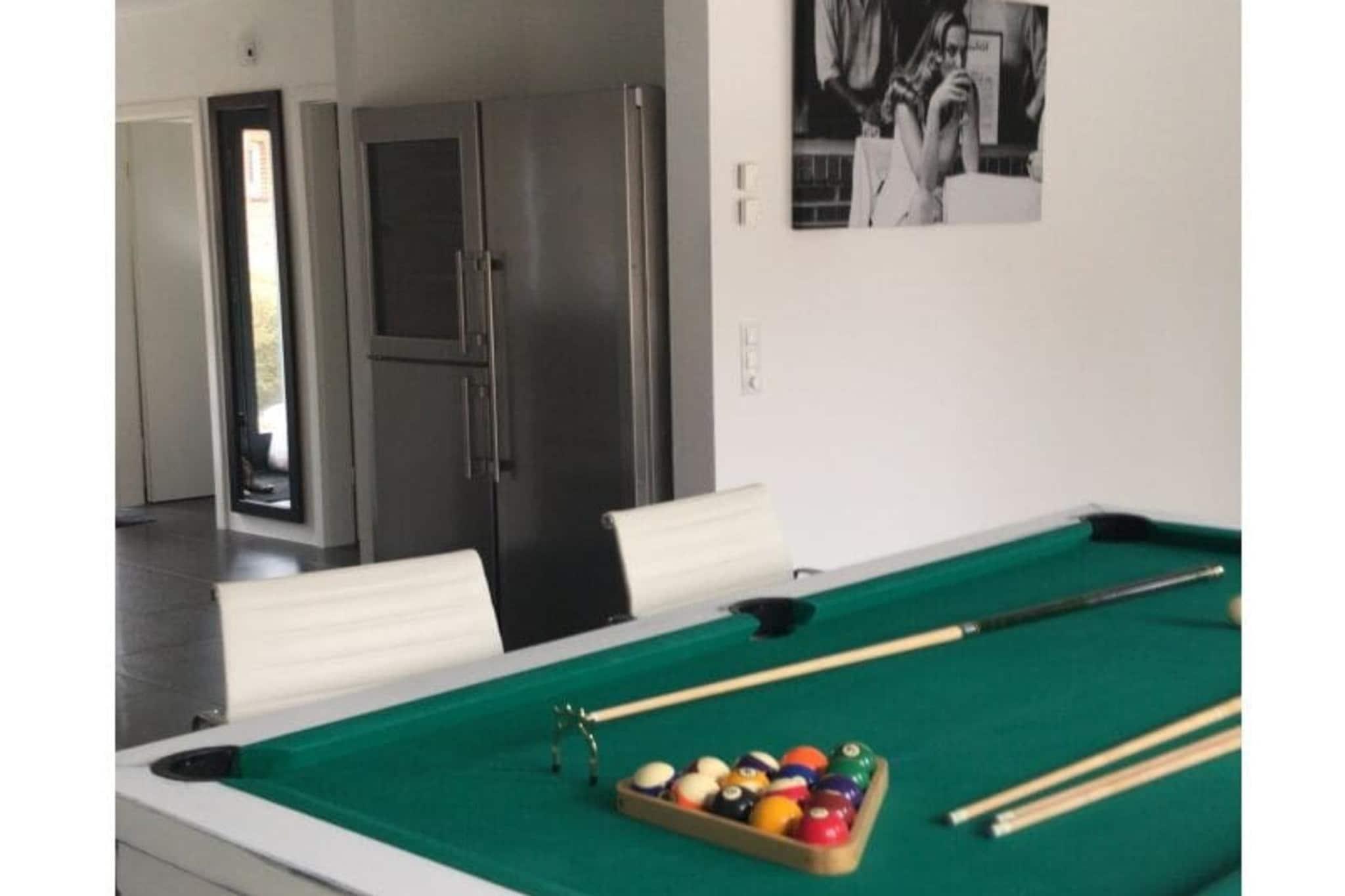 Ground floor: (hallway(Mirror, Wardrobe Coatrack, heating), hall(Mirror, toilet, bath tub, bath tub, shower, shower, washbasin, bidet, heating, hairdryer), open kitchen(oven, microwave, washing machine, heating), open kitchen(Egg Cooker, Mixer, Spices, Tea Towels, Kitchenette, dining table, stove, electric kettle, toaster, coffee machine, oven, dishwasher, fridge, freezer, freezer, heating, Food processor), Living/diningroom(Pool Table, Sofa, library, TV, dining table, stove, heating), bedroom(Bed Linen, double bed, TV, heating), bedroom(Bed Linen, Wardrobe, double bed, heating), bedroom(Bed Linen, double bed, TV, heating), bedroom(Bed Linen, double bed, TV, heating), bathroom(Mirror, toilet, bath tub, shower, shower, washbasin, heating, hairdryer), guest toilet(Mirror, toilet, washbasin, heating), relaxation area(sauna, bath tub), storage(Vacuum Cleaner, cot, high chair, ironing board, iron, drying cabinet), heating) Hot Water, Vacuum Cleaner, carport, Internet access, tumble dryer, washing machine, heating, terrace(Sun Umbrella, Beach, garden furniture, sun loungers), terrace(Sun Umbrella, Beach, garden furniture, sun loungers), parking, ironing board, iron, drying cabinet