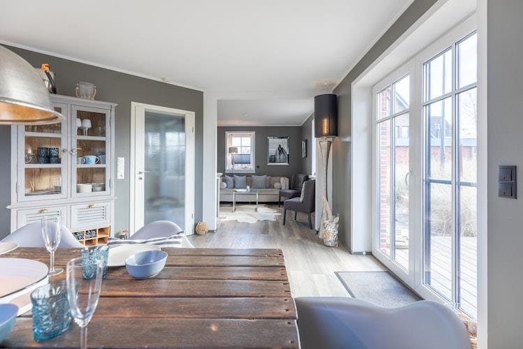 The 110sqm holiday home in Tating is spread over two levels and offers space for the whole family. Enjoy the time in the open living and dining area or cook together in the well-equipped kitchen. Outside, a 625sqm garden awaits you, which resembles an impressive dune landscape. There you can relax in a beach chair or on the two loungers. The accommodation has three bedrooms in the attic. One bedroom has an ensuite bathroom with a floor-level shower and heated towel rail, as well as a dressing area. There is also a shower room on the ground floor, where you have a washing machine at your disposal. There are also three parking spaces in front of the house. Highlights: WiFi, consumption-based energy costs, laundry package, final cleaning The holiday home is located in the rural village of Tating, directly in front of the extensive sandy beaches of St. Peter-Ording (8 minutes by car). Small shops, bakery and shops for daily needs are within walking distance.