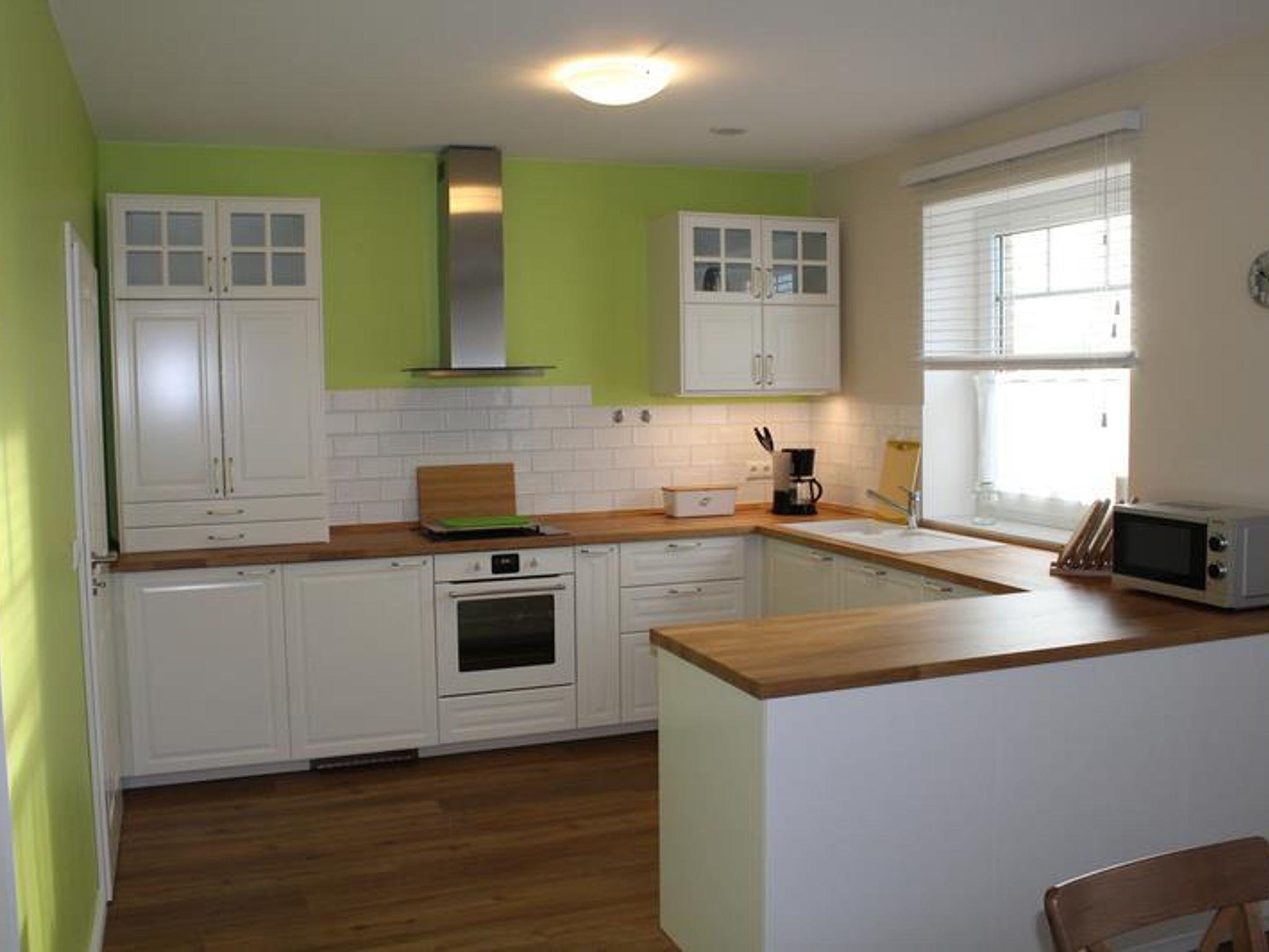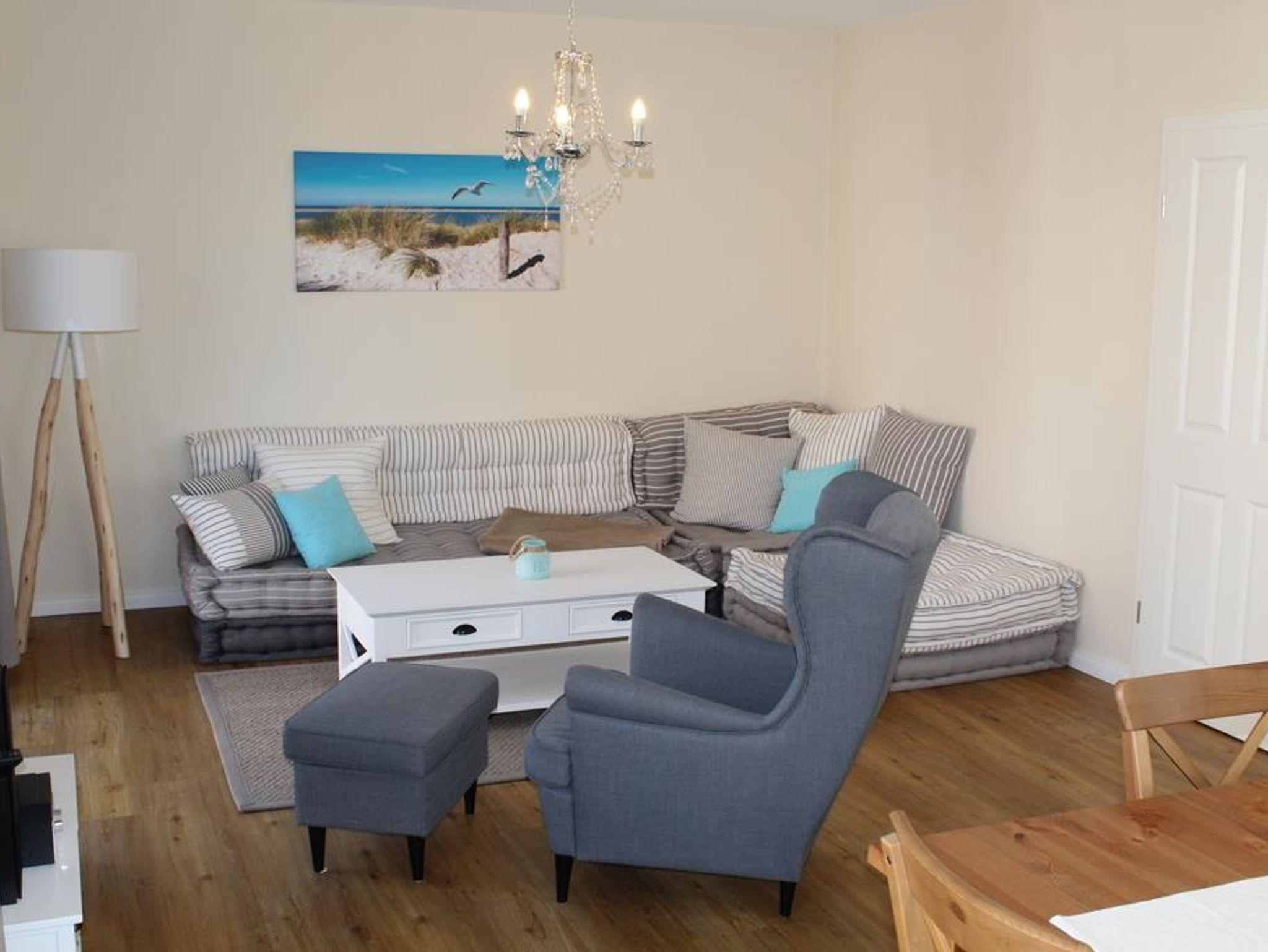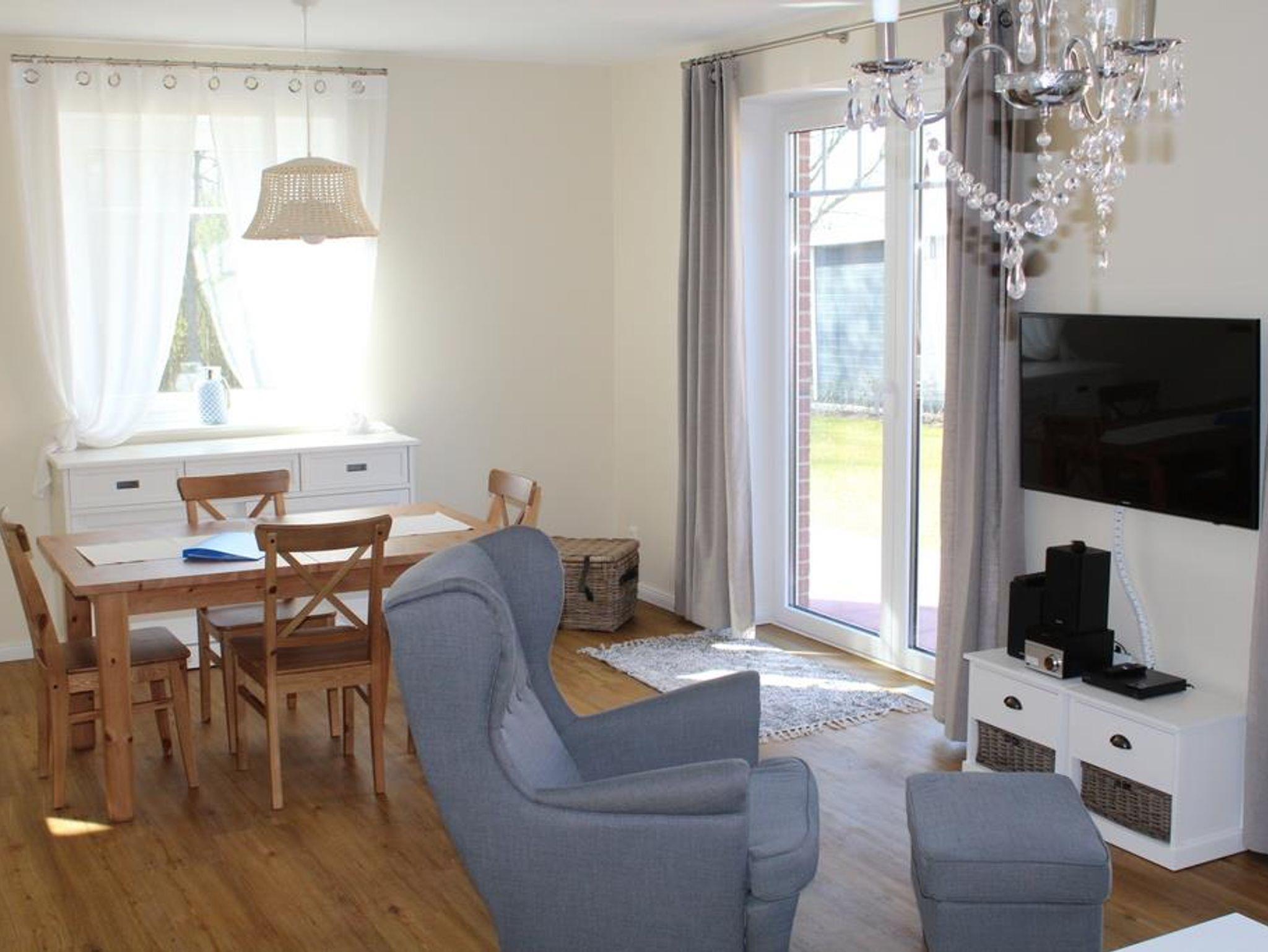 Das Wohnzimmer mit großer offener Küche, Esstisch, gemütlicher Sofaecke, SAT-TV, Radio, Stereoanlage, DVD-Player/Bluray und schöner möblierter Terrasse, die Küche ist mit Ceranfeld, Backofen, Geschirrspüler, Mikrowelle, Waffeleisen ausgestattet.