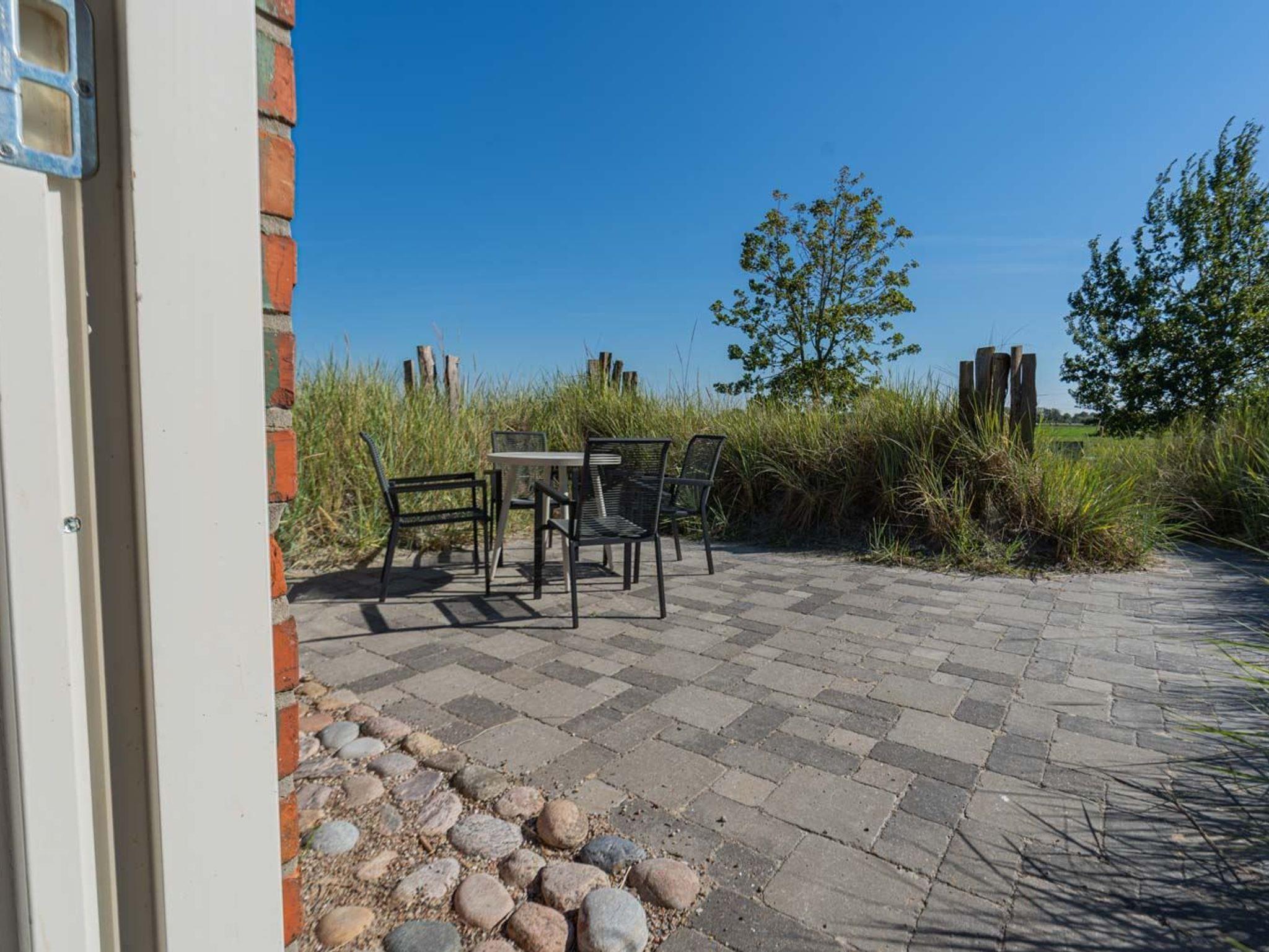 Wohn- und Schlafzimmer mit Sofa, Sessel, SMART-TV, Esstisch mit Sitzbank und 2 Stühlen, Doppelbett (160x200cm, Boxspring) und Kleiderschränken. Offene Küche mit Backofen, Geschirrspüler und Kühlschrank (Gefriermöglichkeit im Gemeinschaftsraum). Direkter Zugang zur möblierten Süd-Terrasse mit Dünengras-Wall.