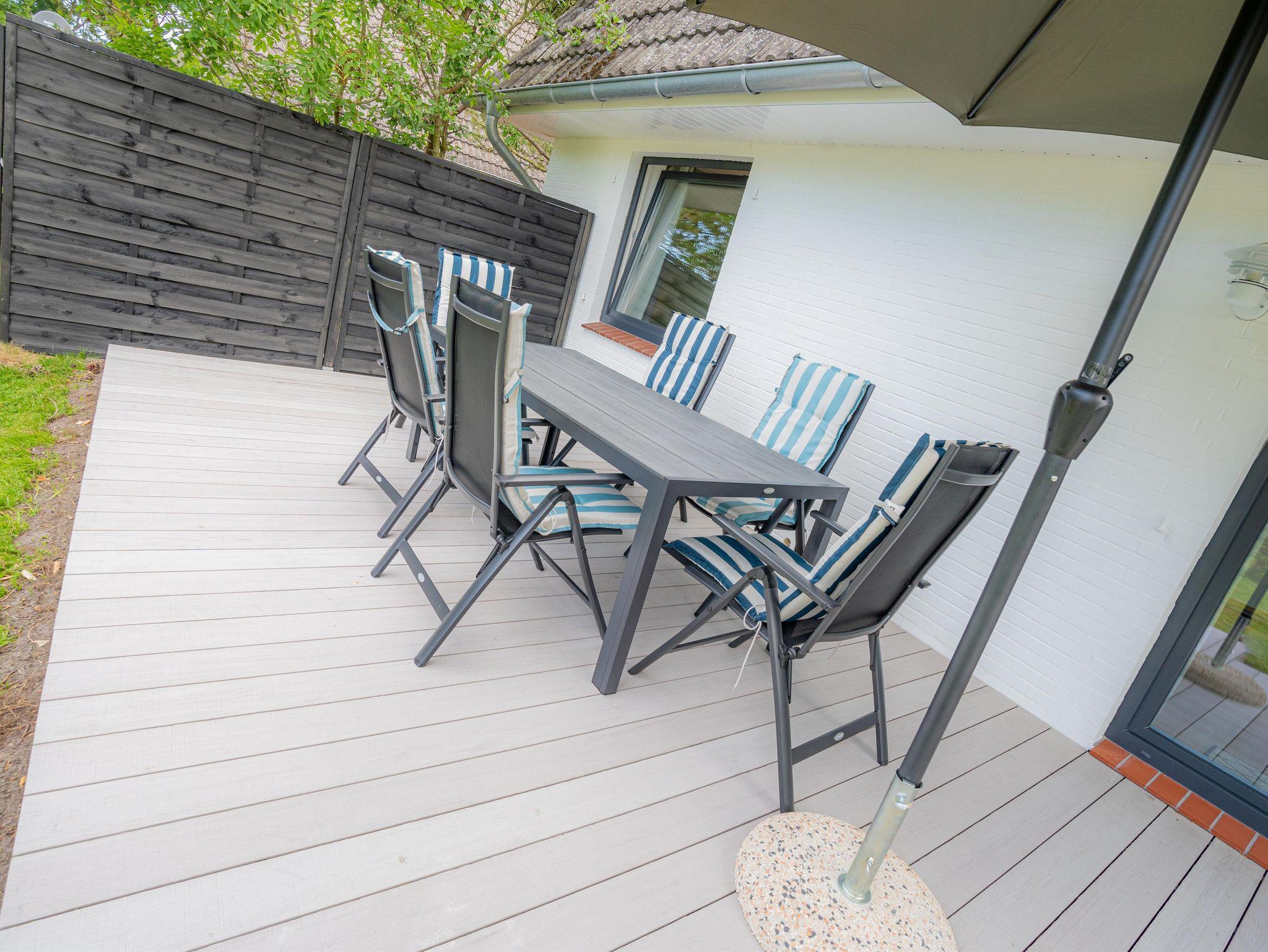Garten mit umlaufender Terrasse mit Gartenmöbeln