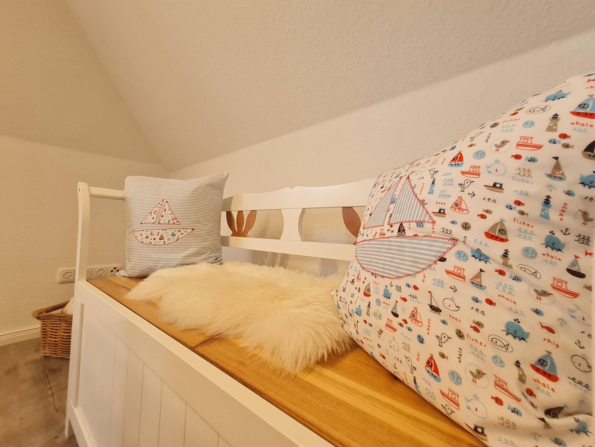 • 2. Schlafraum im Dachgeschoss, mit einem Doppelbett, über eine steilere Treppe zu erreichen, nicht geeignet für kleine Kinder oder Personen mit einer Gehbehinderung