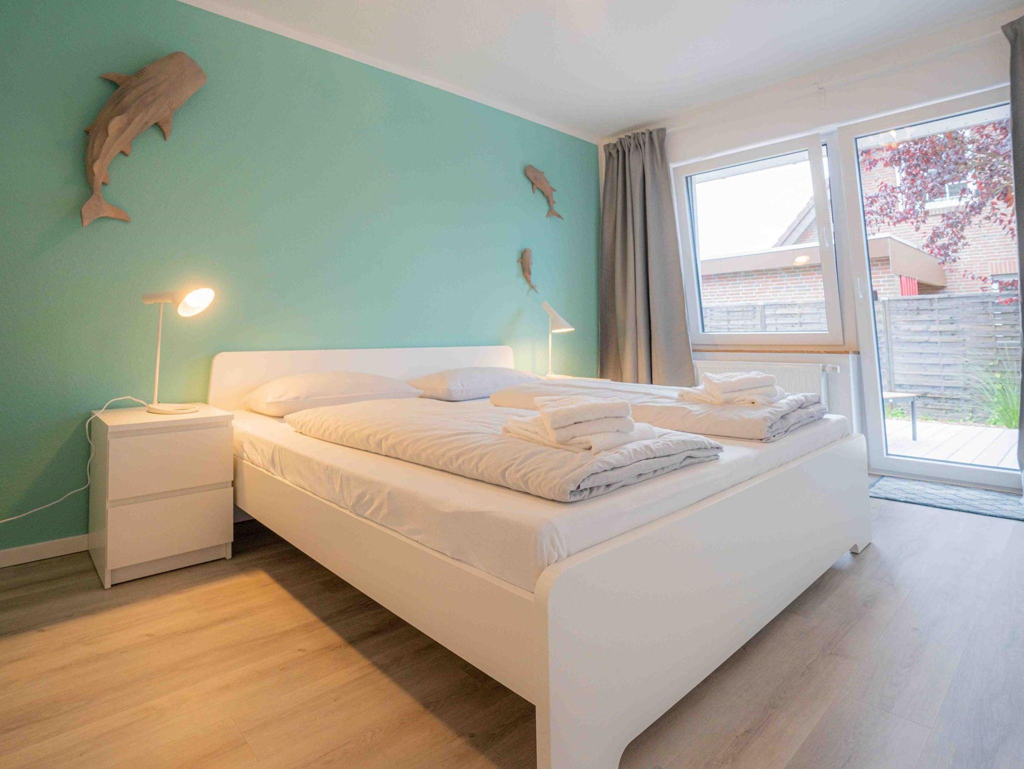 1. Schlafzimmer mit Doppelbett (2x 90x200cm), SMART-TV (Sat), kleinem Schreibtisch, Kleiderschrank und Austritt zur Gartenterrasse nach Süden.