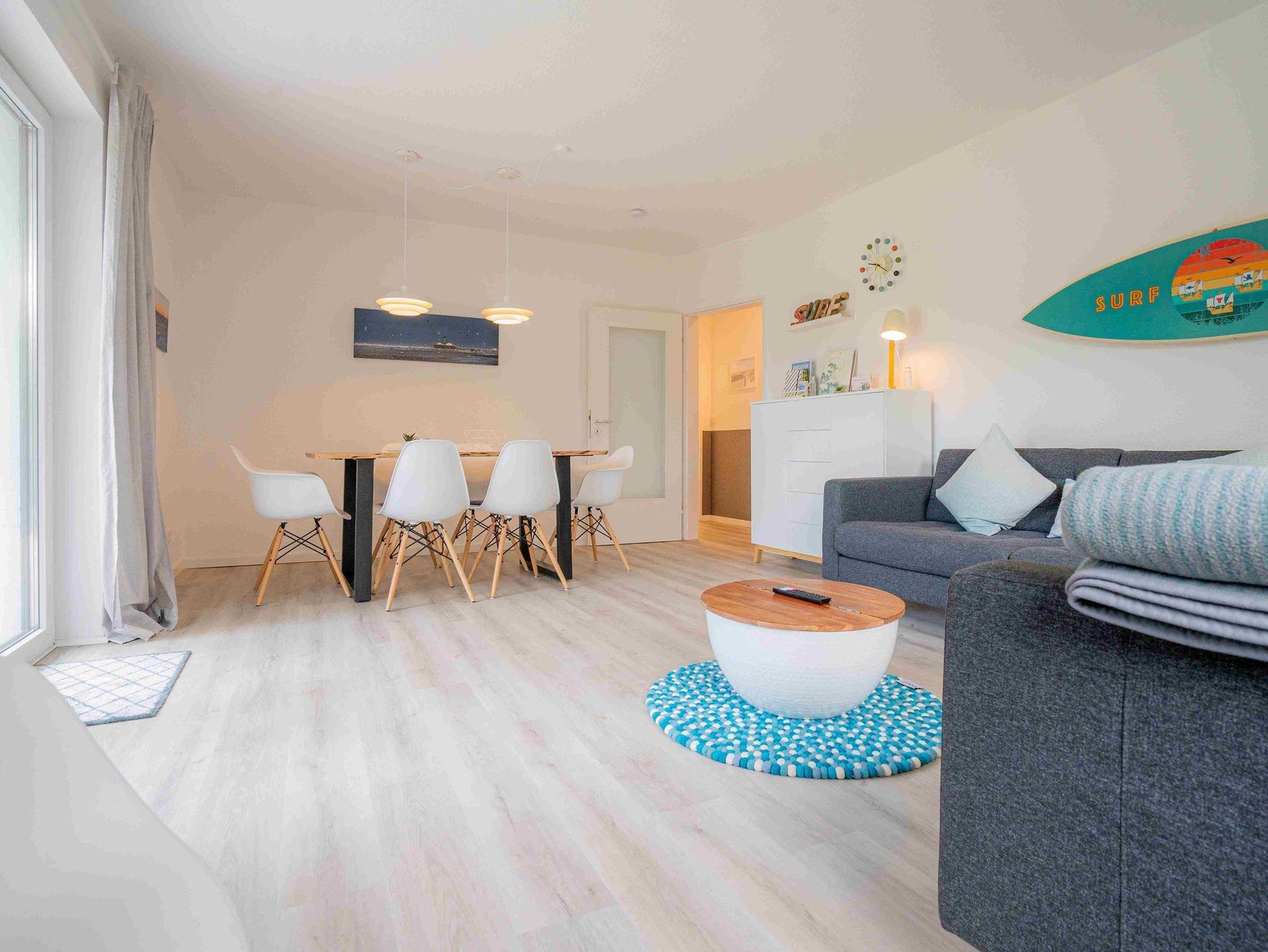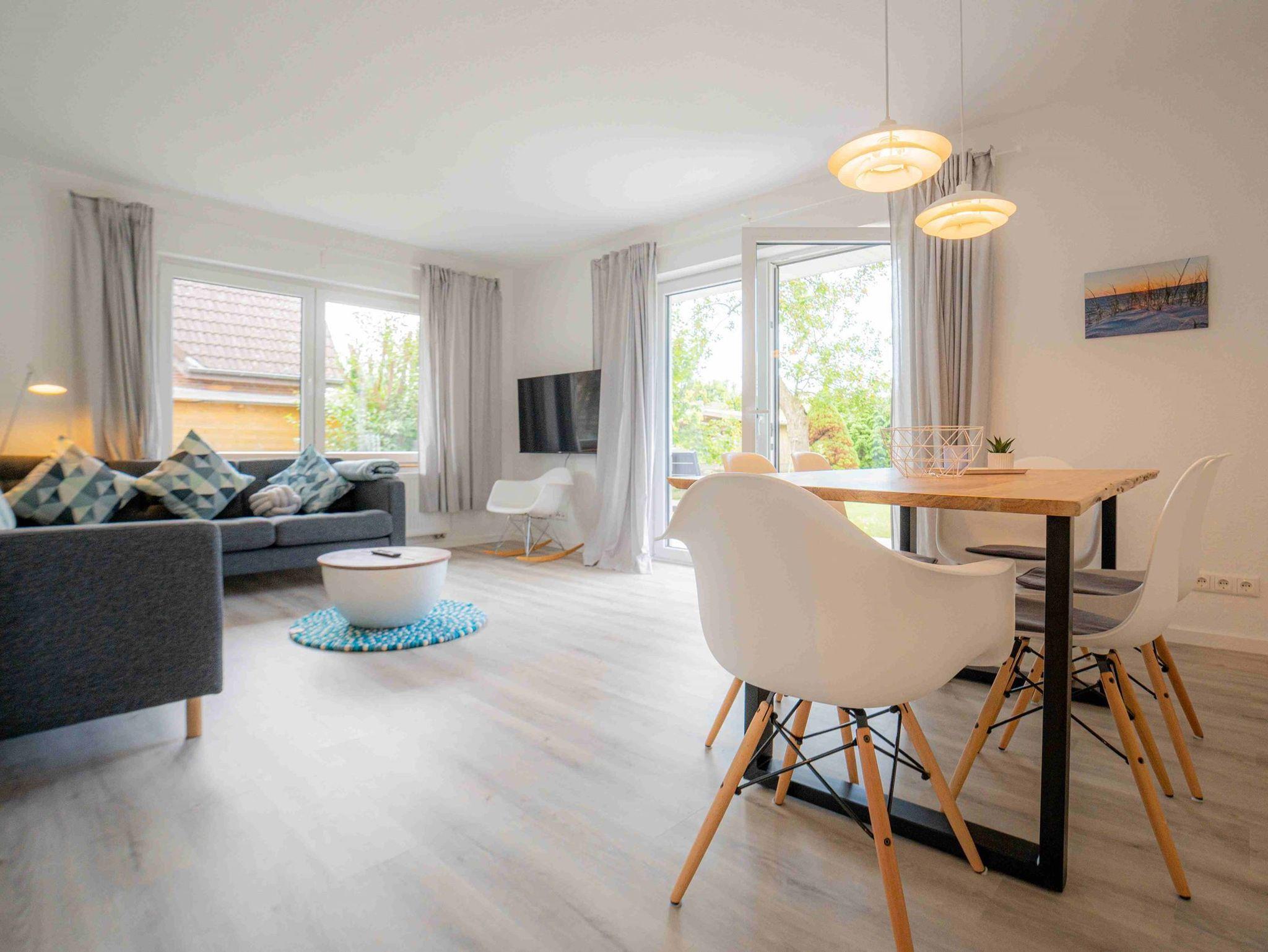 Wohnzimmer mit großem Ecksofa, SMART-TV (Sat), Esstisch für 6 Personen und direktem Zugang zur möblierten Gartenterrasse nach Süden und Westen mit Strandkorb.