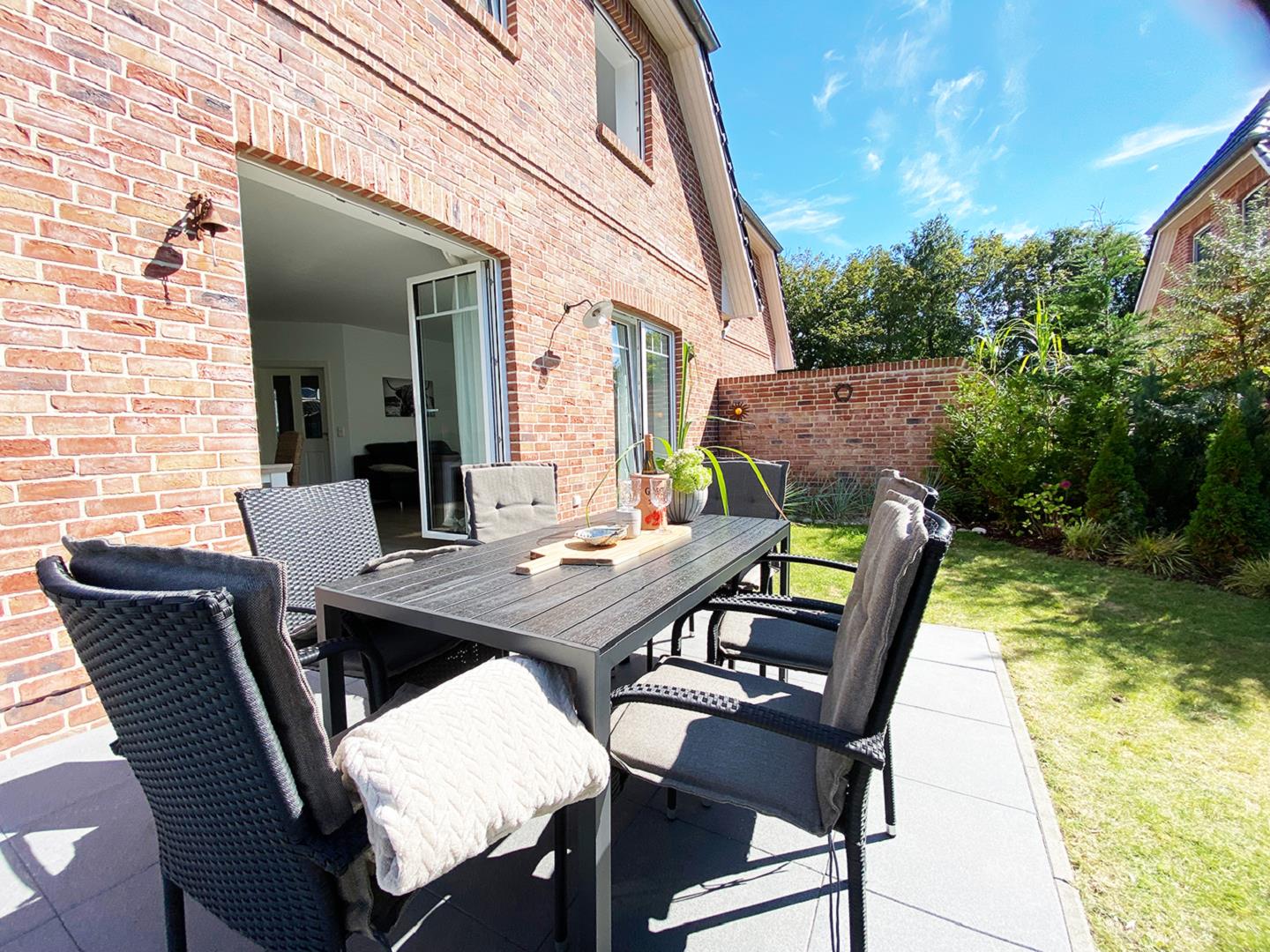 Die sonnenverwöhnte Terrasse und Garten mit Gartenmöbeln und Sonnenschirm lädt zum Entspannen ein.