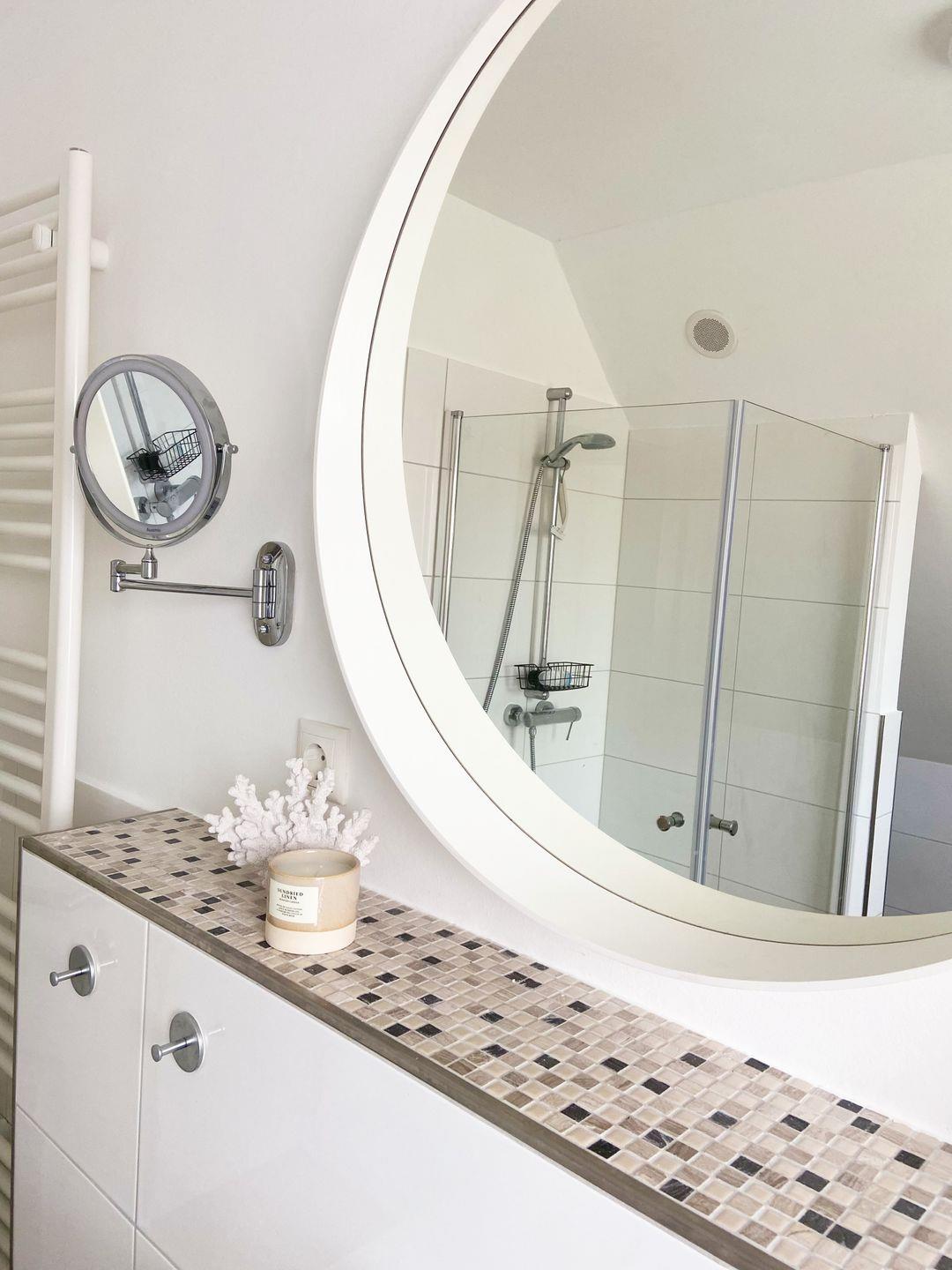 Das große Bad mit Fenster im Obergeschoss hat eine Dusche und eine Badewanne und kuschelig warme Handtücher durch die Handtuchheizung. Im Erdgeschoss befindet sich ein weiteres Badezimmer mit Dusche und WC. Der Hauswirtschaftsraum ist umfangreich ausgestattet mit Waschmaschine, Trockner, Wäschetrockenständer, Bügelbrett etc.